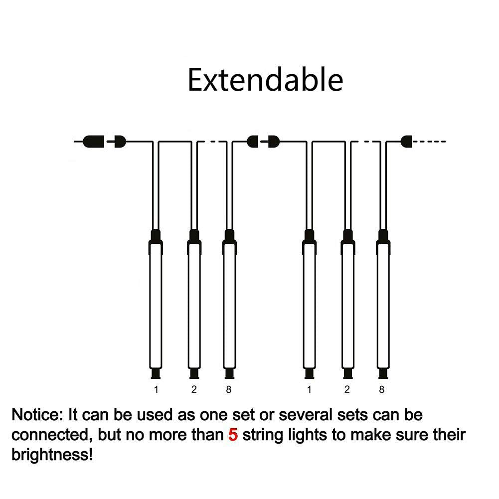 - 【Romantic Meteor Shower Lights】Led falling rain drop lights, the light of every bulb turns on and out one by one in sequence and quickly just like meteor shower or falling rain in the night sky, very beautiful. These icicle string lights can be used as one or be connected (The best effect is to connect 3-4 strings).