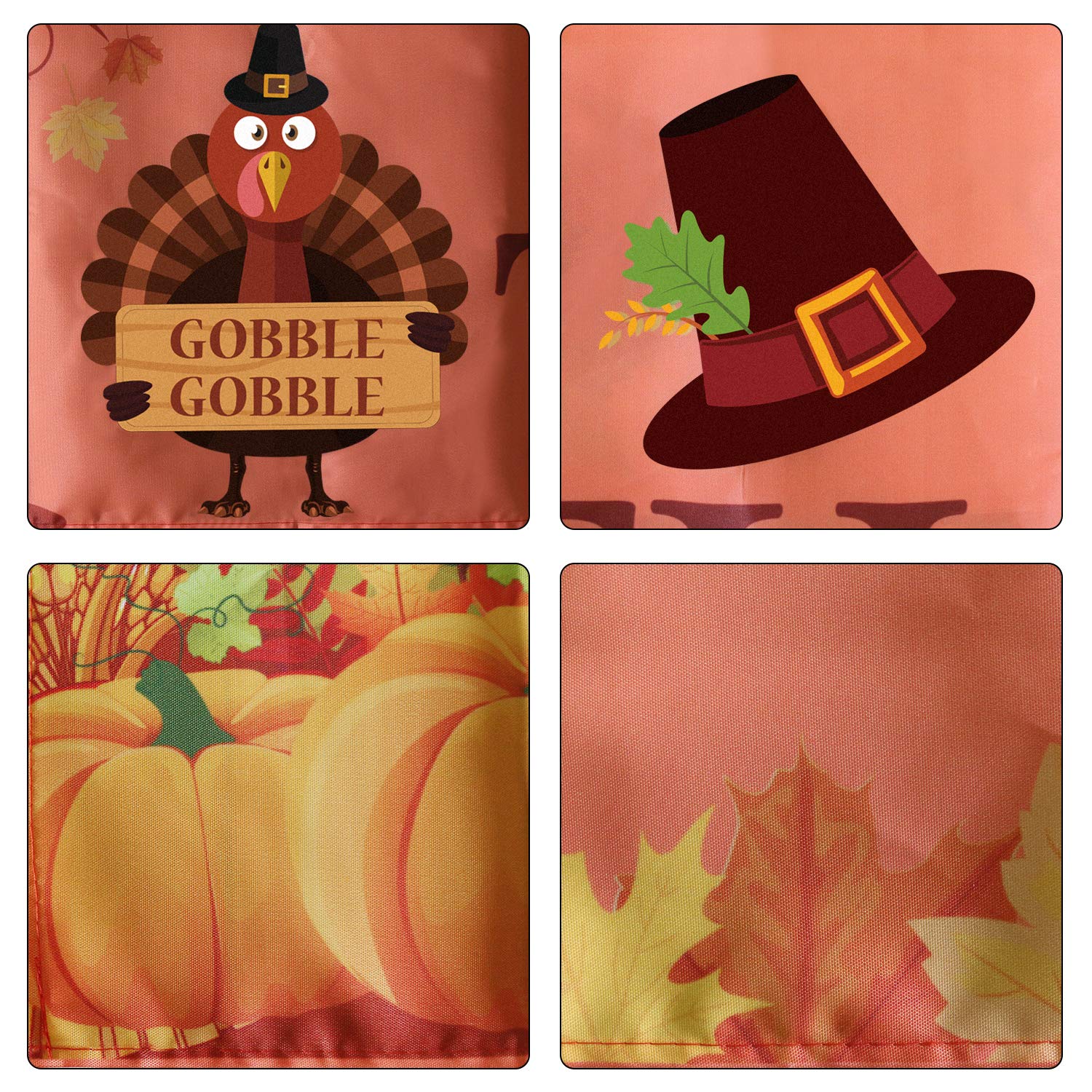 - UNIQUE DESIGN: This Happy Thanksgiving banner is the perfect centerpiece for your Thanksgiving and Autumn Decor. The "Happy Thanksgiving" letters, Maple Leaves, Turkey, hat and Pumpkins are printed on orange polyester banner.Each element is completely detailed and decorated to coordinate with the thanksgiving theme and decor.