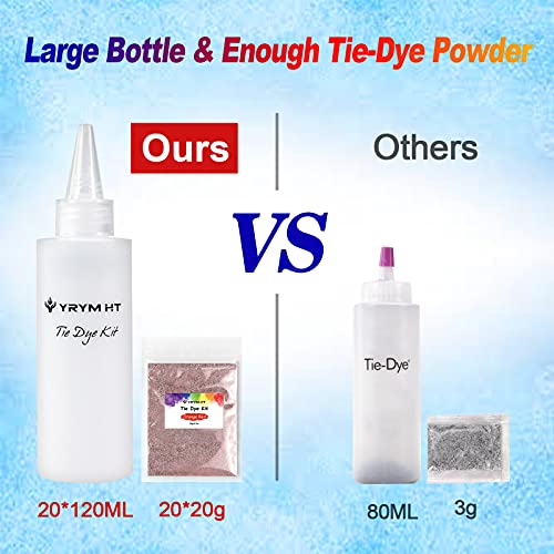 - 👚【239 PACK ALL IN ONE LARGE CAPACITY KIT】: Our large tie dye kit for kids including 20pc squeeze bottles(120ml), 20 bags of tie-dye pigment(20g), 199pcs tie dye kit operating tools. No need to seek dazzled gadgets on market any more, you will get everything to start dyeing fabric with YRYM HT tye dye kit. Large capacity allows you dyeing up to 60 medium adults T-shirts depending on thickness, design, so you can dye whatever you like and create your own colors by mixing different color together!