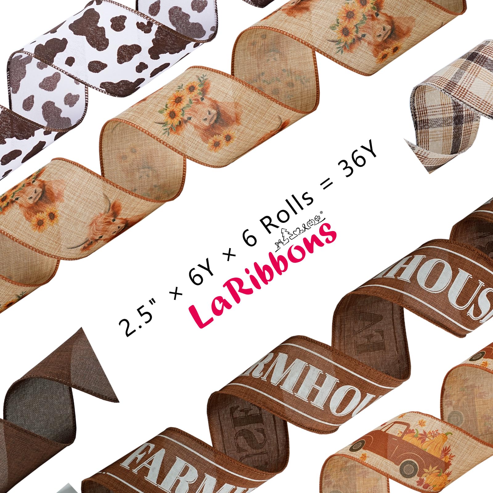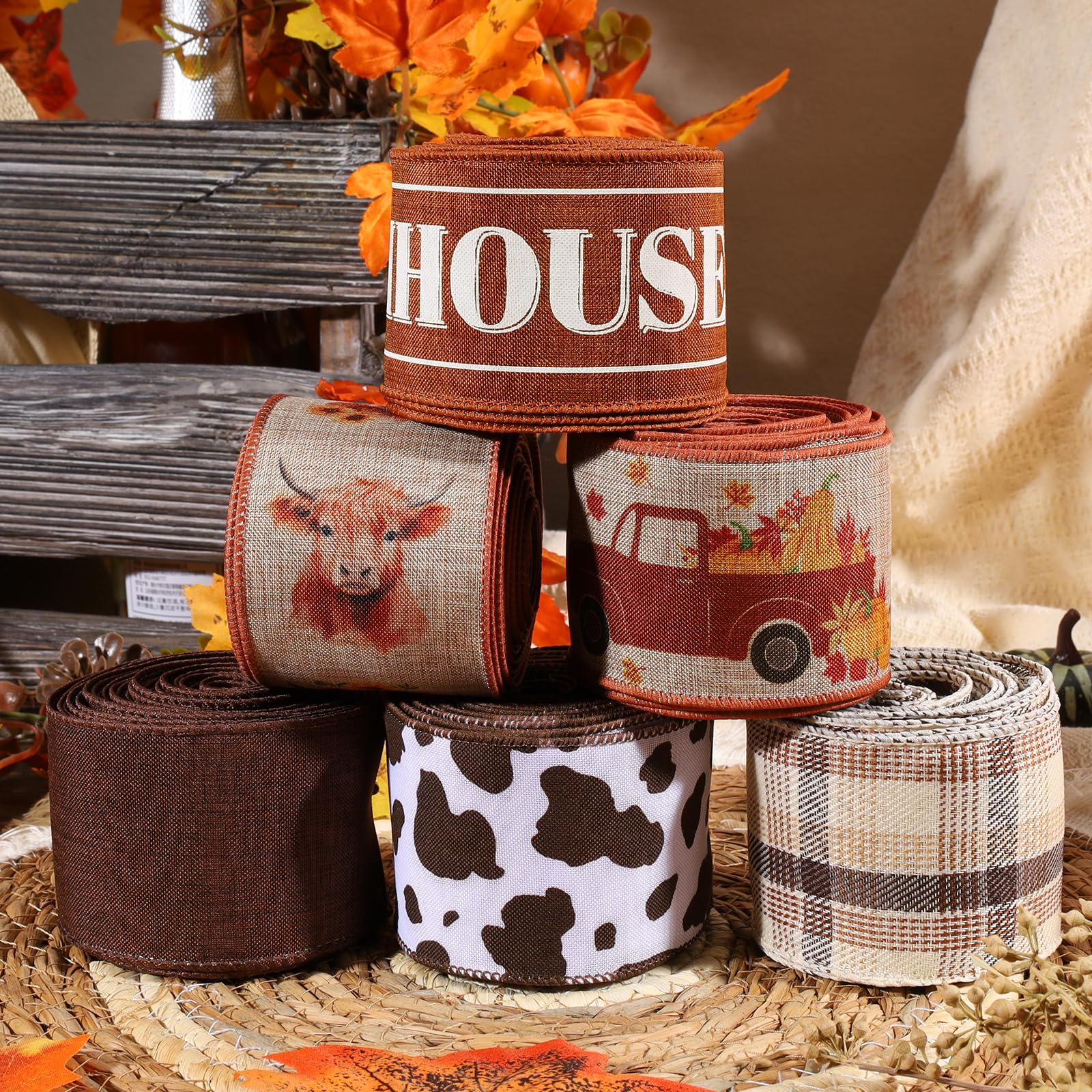 Fall Burlap Plaid Ribbon Wired 2 1/2" x 6 Yards 6 Rolls, Harvest Farm Ribbon for Autumn Wreath Thanksgiving Christmas Farm Gift Wrapping Home Decor