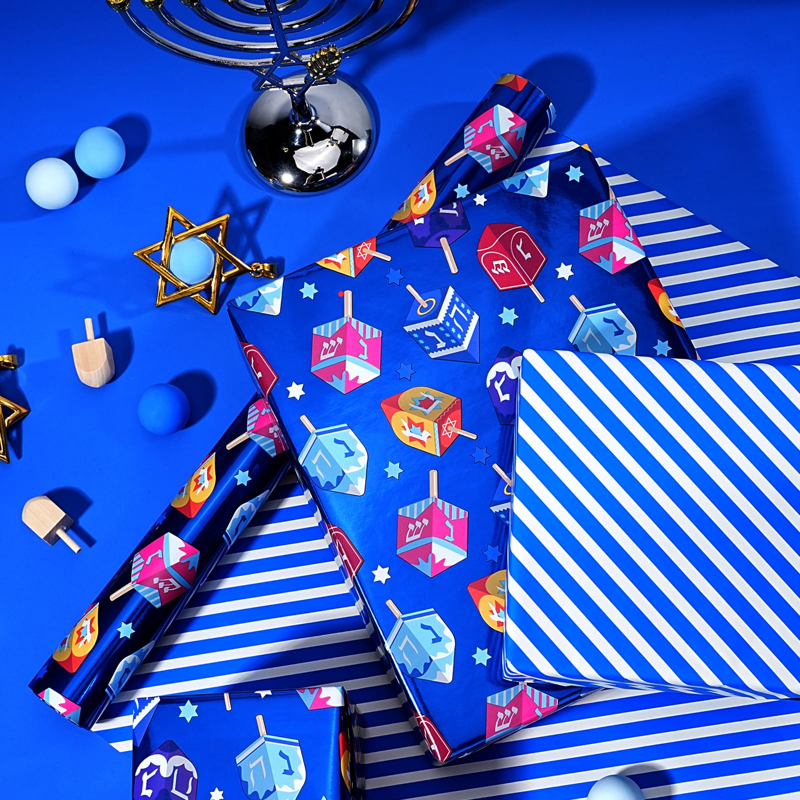 - Versatile Double-Sided Patterns – One roll, two looks: colorful dreidels on one side, classic blue-white stripes on the other, great for gift wrapping or DIY crafts
