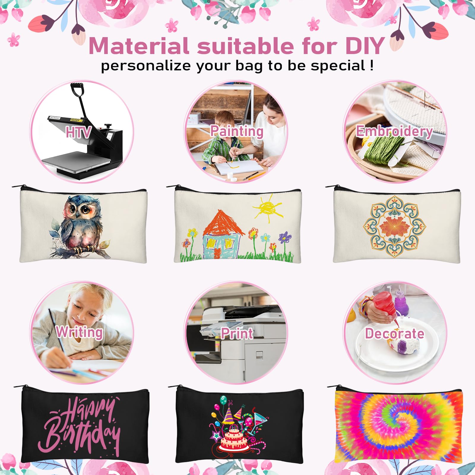 - High Quality: Made of premium canvas, lightweight, soft and long-lasting, not easy to tear, zipper work smoothly, the bag itself feels they will last for a long time, you can add an iron on vinyl transfer to personalize canvas bags