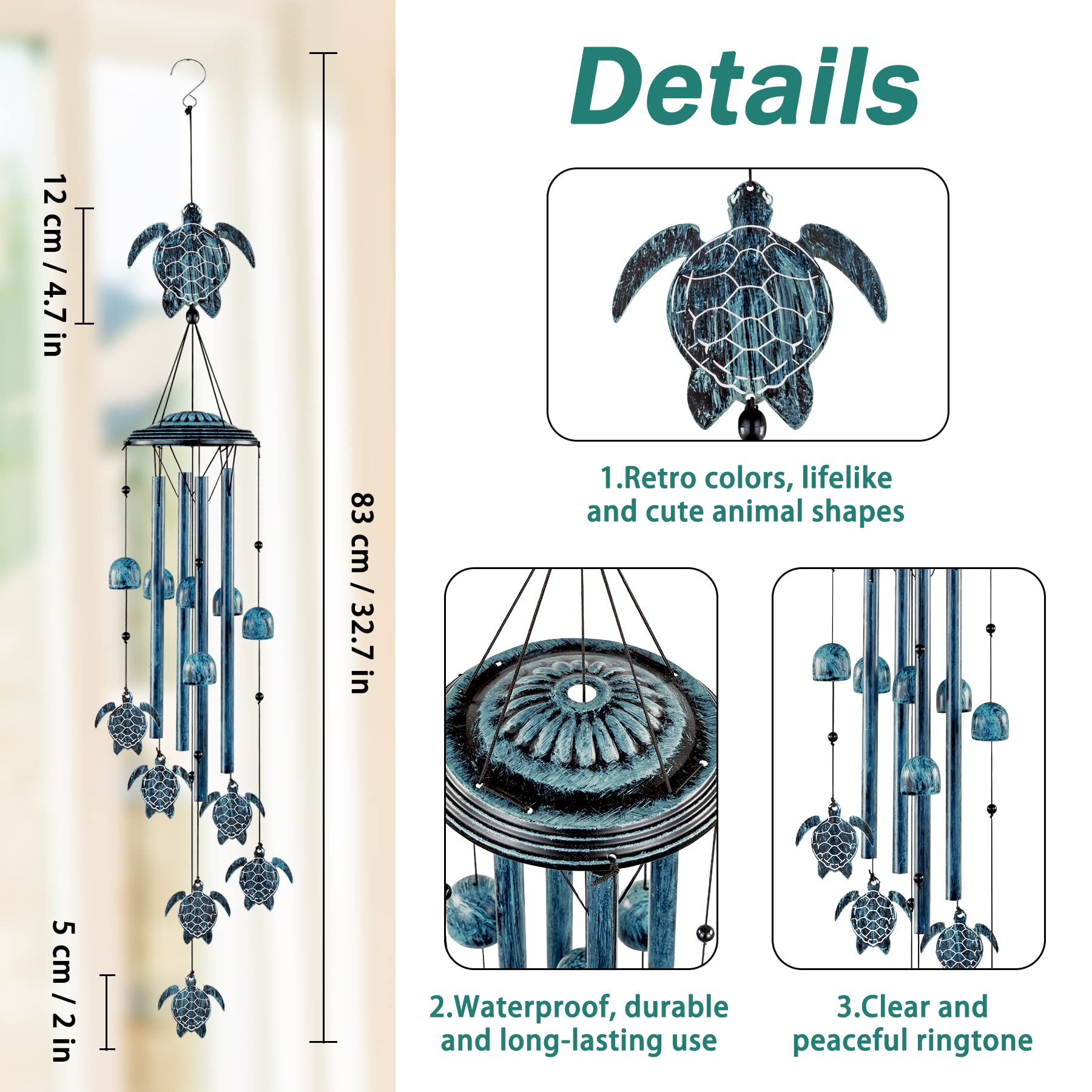 - Ingenious design: Metal large turtle decor with 4 durable bronze green aluminum metal tubes, 6 bells, 6 metal turtles, aluminum metal tube is about 10 inches long. Connected by rugged nylon cord, light weight and easy to hang. Indoor/outdoor use. Overall size: 32.7 inches. Package Include: Turtle wind chime * 1