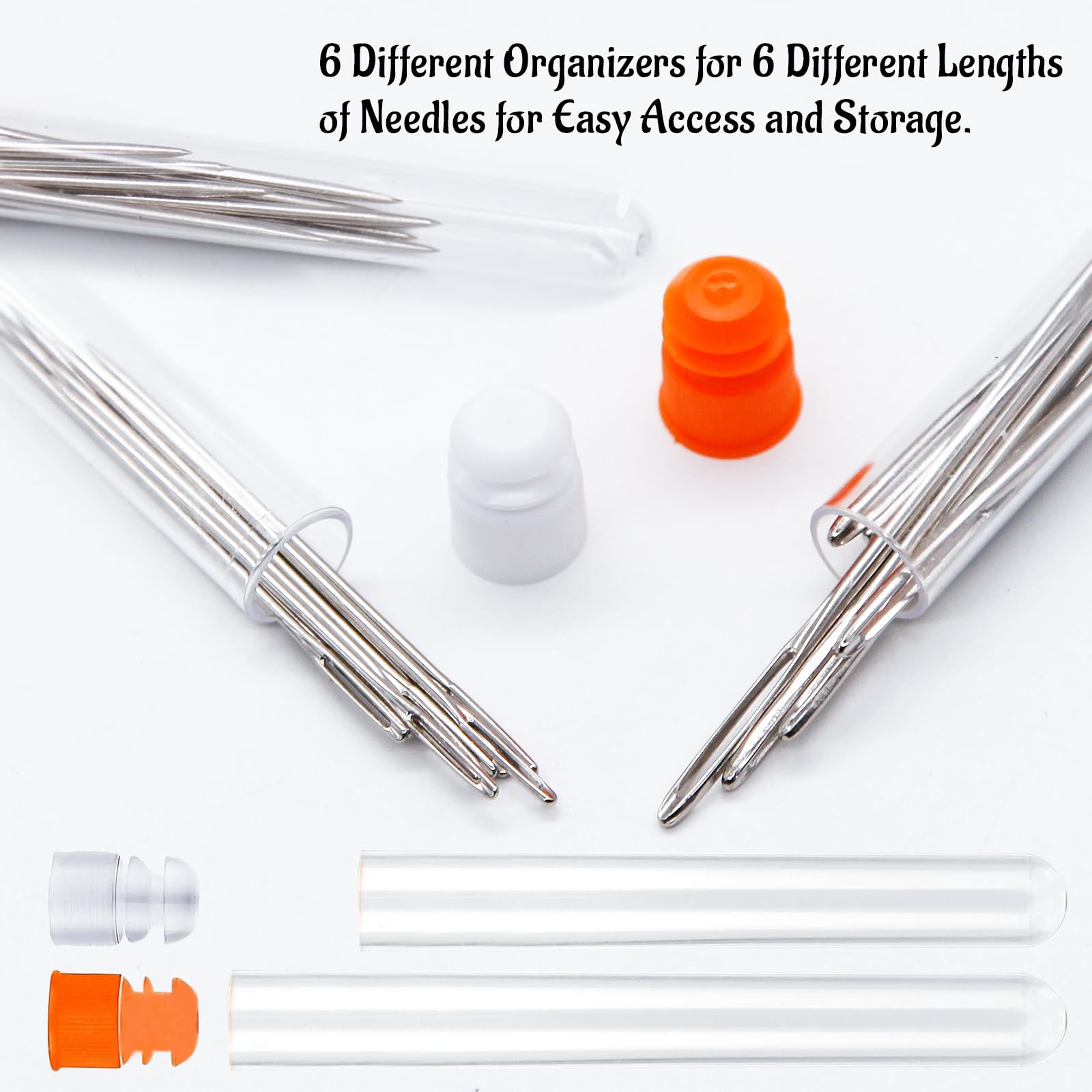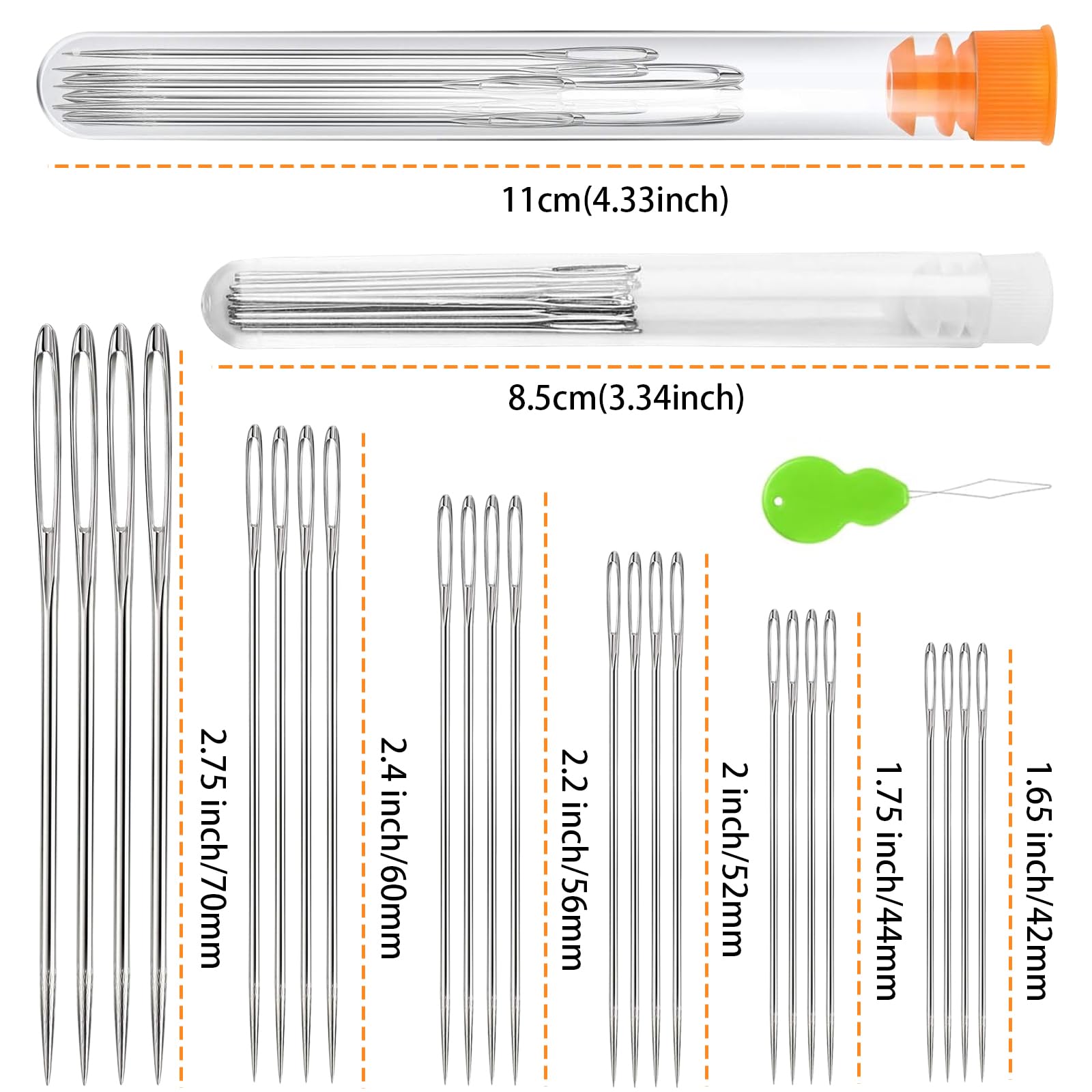 - [Different Sizes]- Package contains 60 pieces large eye pointed stitching needles in 6 sizes, (10pcs x 1.65 inch/42mm, 10pcs x 1.75 inch/44mm, 10pcs x 2 inch/52mm, 10pcs x 2.2 inch/56mm, 10pcs x 2.4 inch/60mm, 10pcs x 2.75 inch/70mm). Also contains 1 piece threader and 6 pieces of needle bottles.
