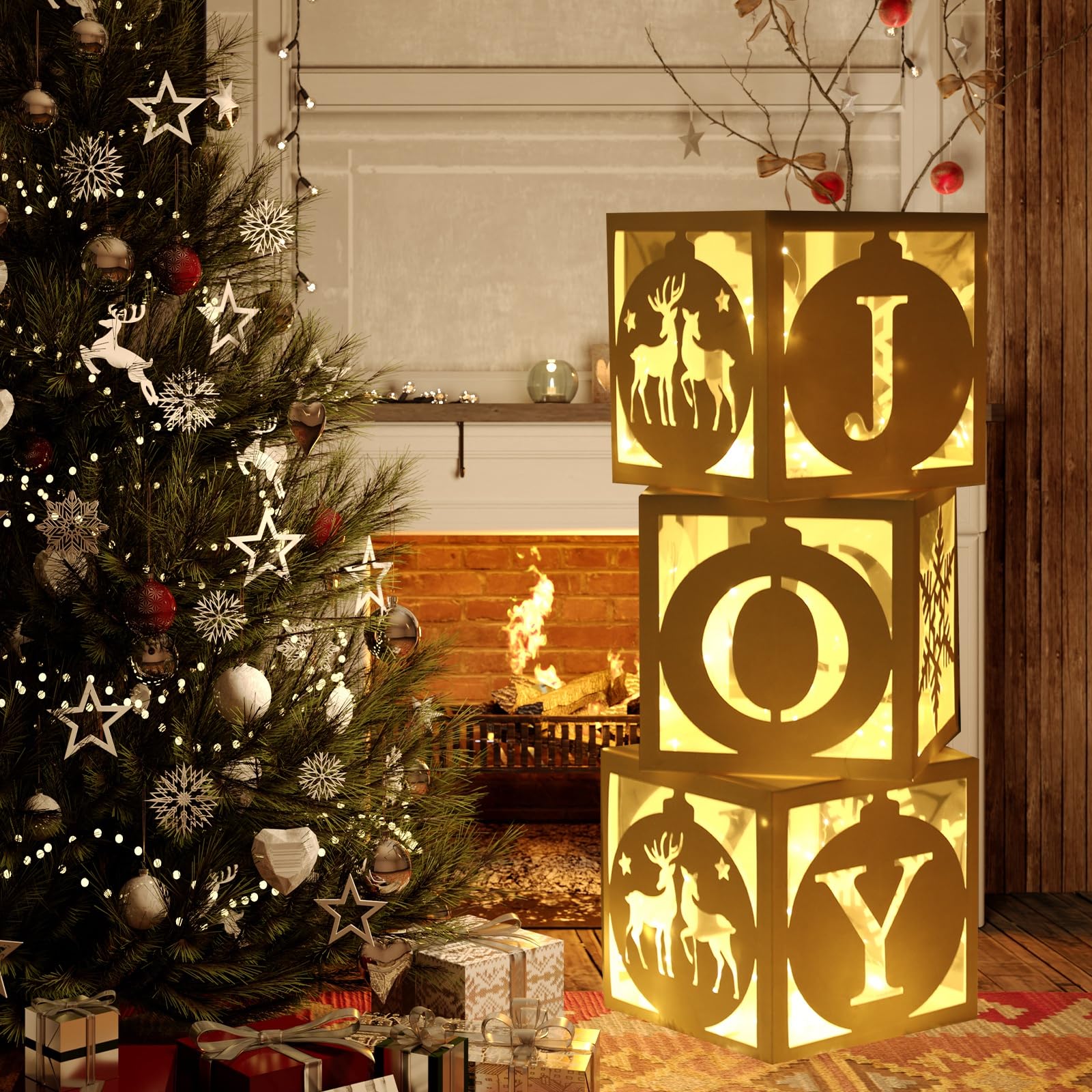 - Package Included - This set of Christmas decorations for home includes 3pcs 11.81''x 11.81''x 11.81'' white paper boxes printed with distinctive cutout patterns and JOY letters and 3pcs warm light strings. You can order one set or more of this product according to your needs.