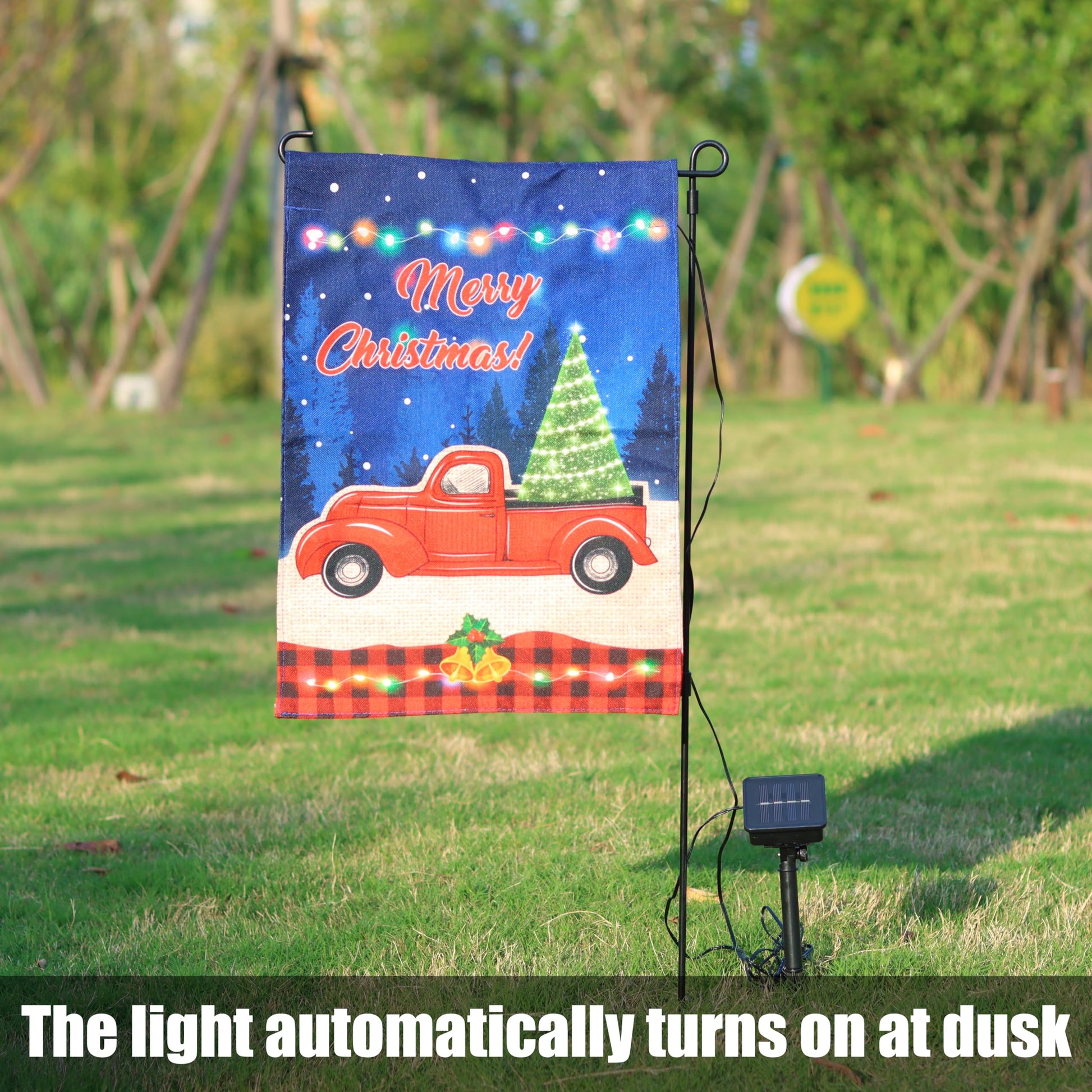 - [UNIQUE DESIGN]: Christmas truck garden flag is equipped with solar lights and solar panel. The light automatically turns on at dusk, and off to charge during the daytime as long as the solar panel is exposed to the sunlight. (Note: the flagpole not included.)