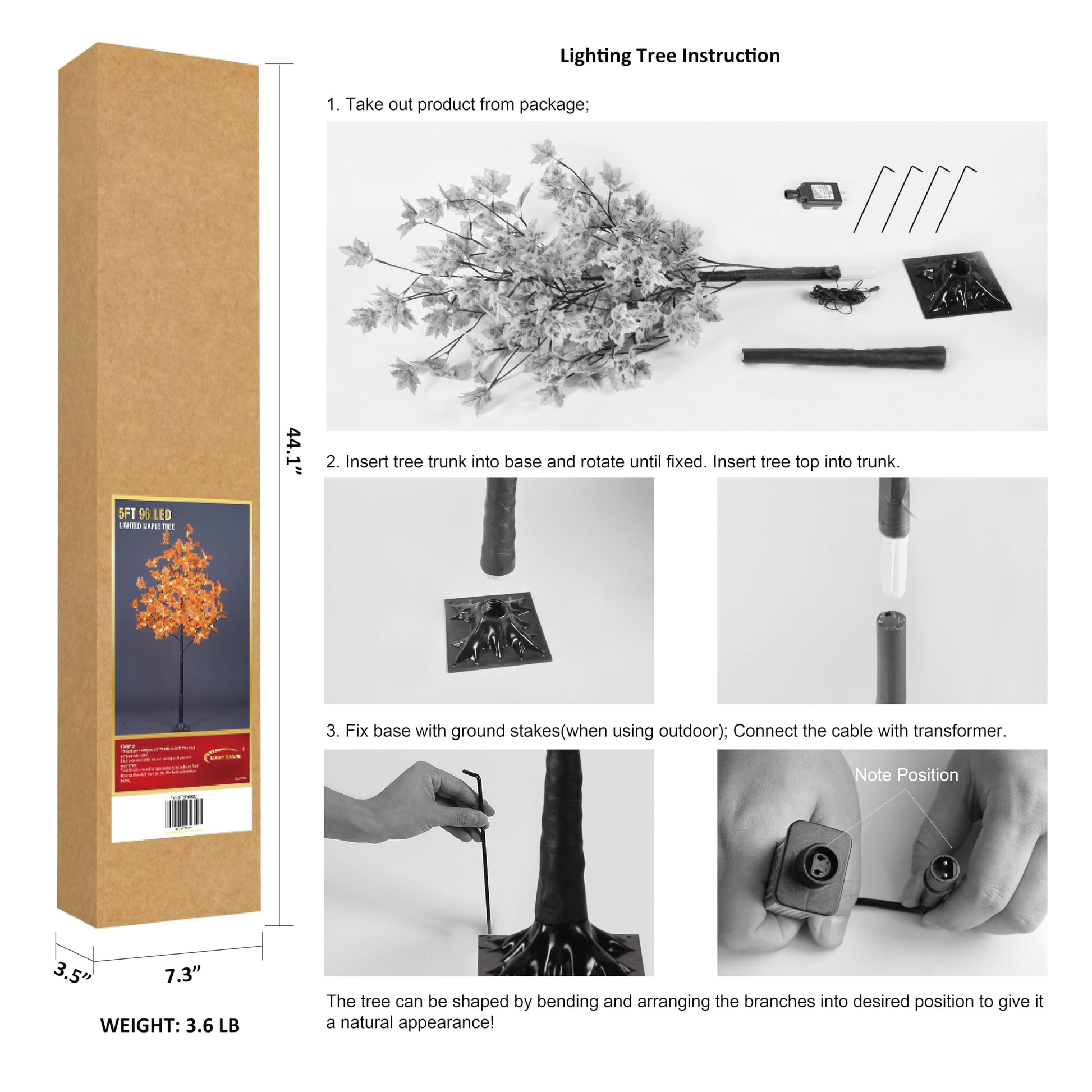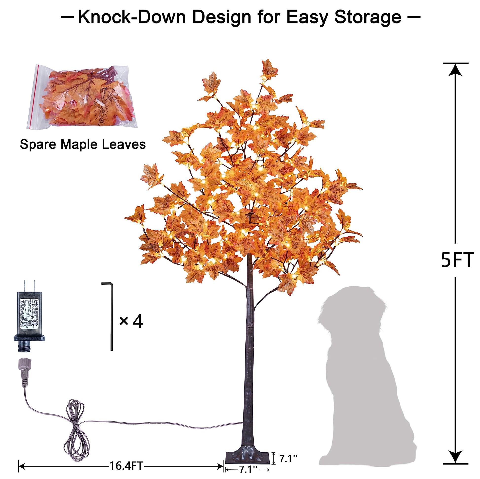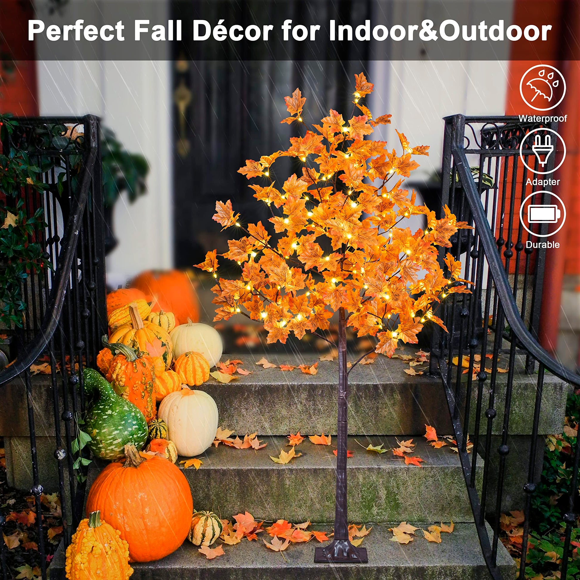 - 5FT Fall Maple Tree with 96 warm white lights, natural looking maple leaves and brown finish trunk, patent protection.