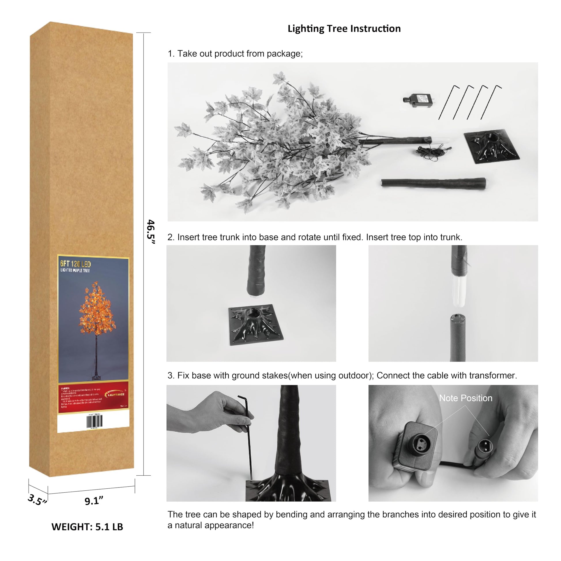 - Lighted maple tree with 120 warm white lights, natural looking maple leaves and brown finish trunk, patent protection.