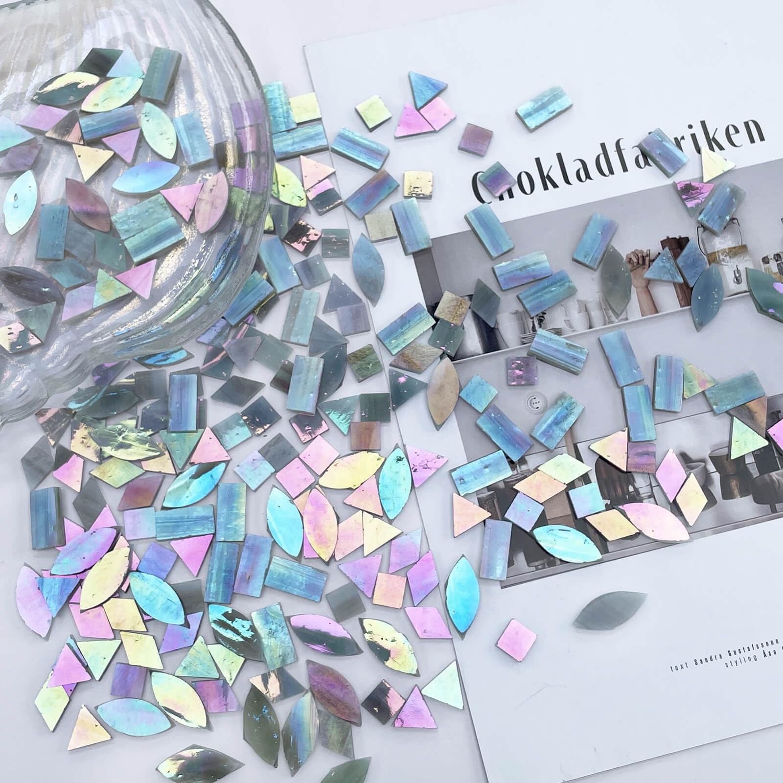 LITMIND Iridescent Ash Gray Stained Glass Mosaic Tiles for Crafts - 240 Pieces, 5 Shapes Mixed (Rectangle, Triangle, Rhombus, Square, Leaf) - Ideal for Mosaic Making Projects and Beginners