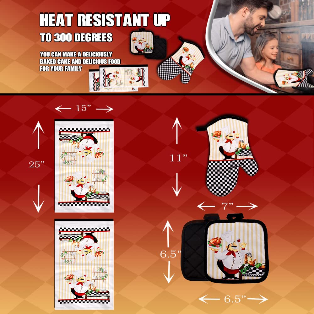 Lobyn Value Packs - Charming 5 Piece Kitchen Towel Set: Chubby Uniformed Chef Design, includes 2 Decorative Dish Towels (25x15) 1 Oven Mitt and 2 Potholders (6.5 Sq)