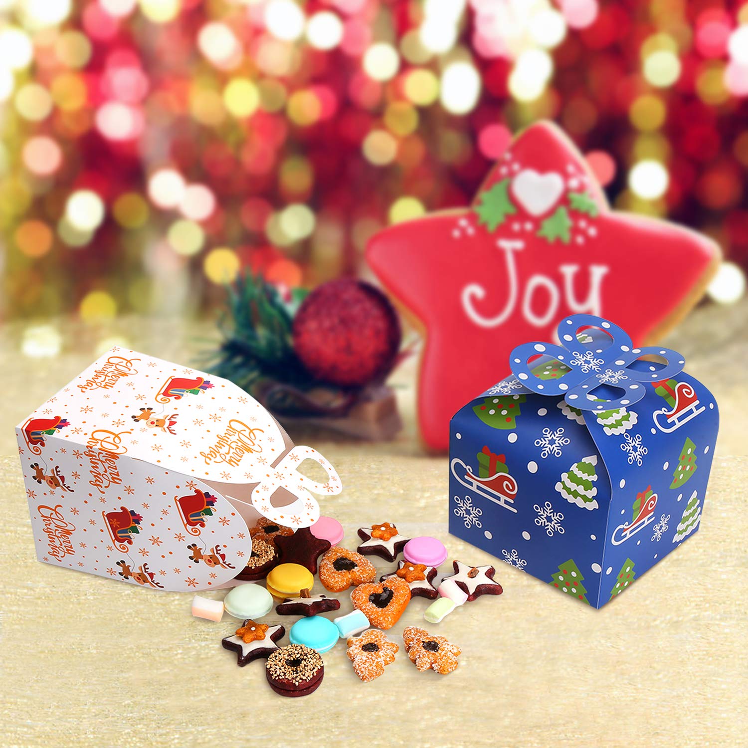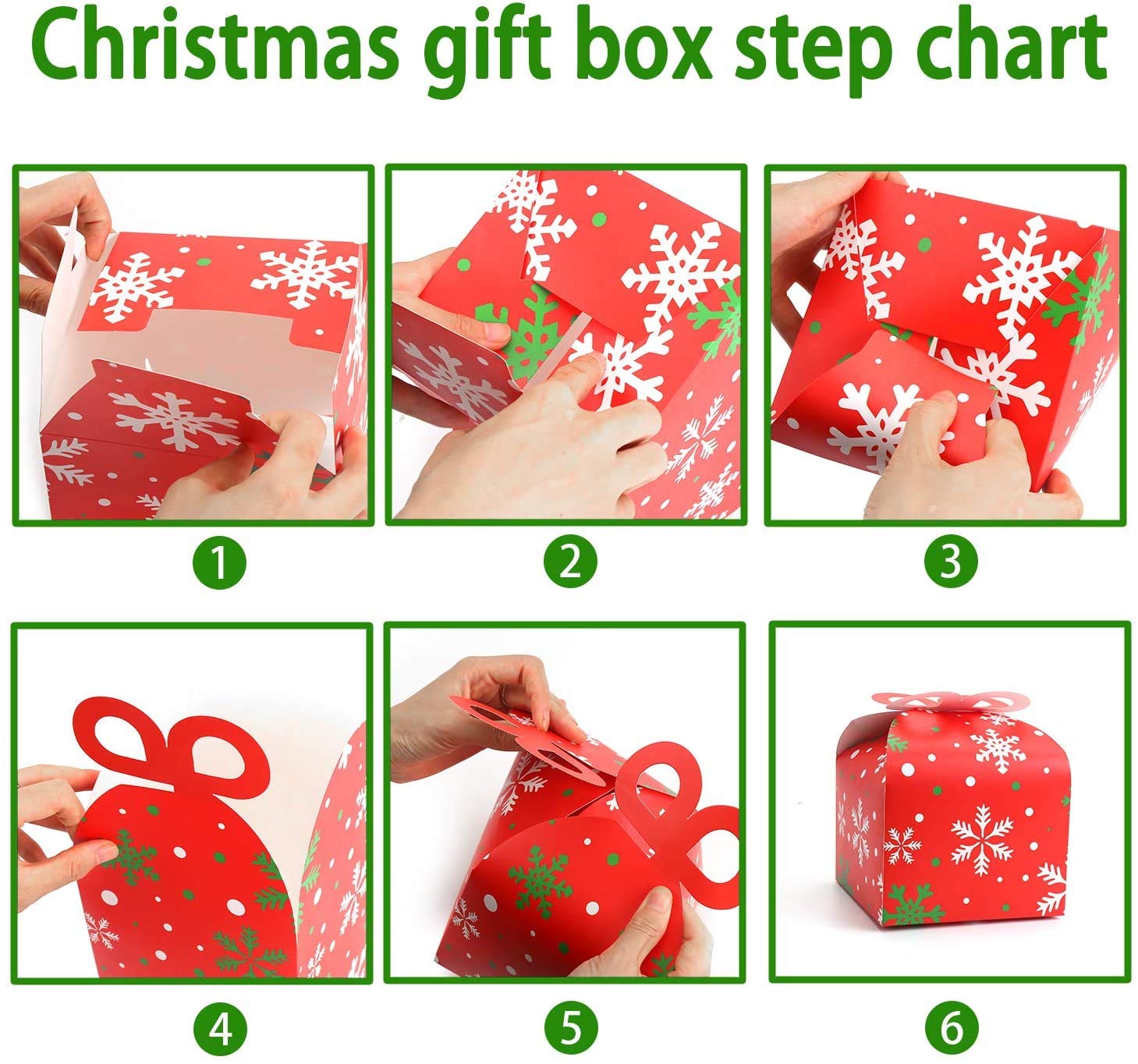 - EASY ASSEMBLY: The Christmas treat boxes are packaged flat and are easily folded into shape with an “automatic lock box” design. You just simply pull the sides into shape and the base will lock into position. No additional preparation or adhesive is needed.