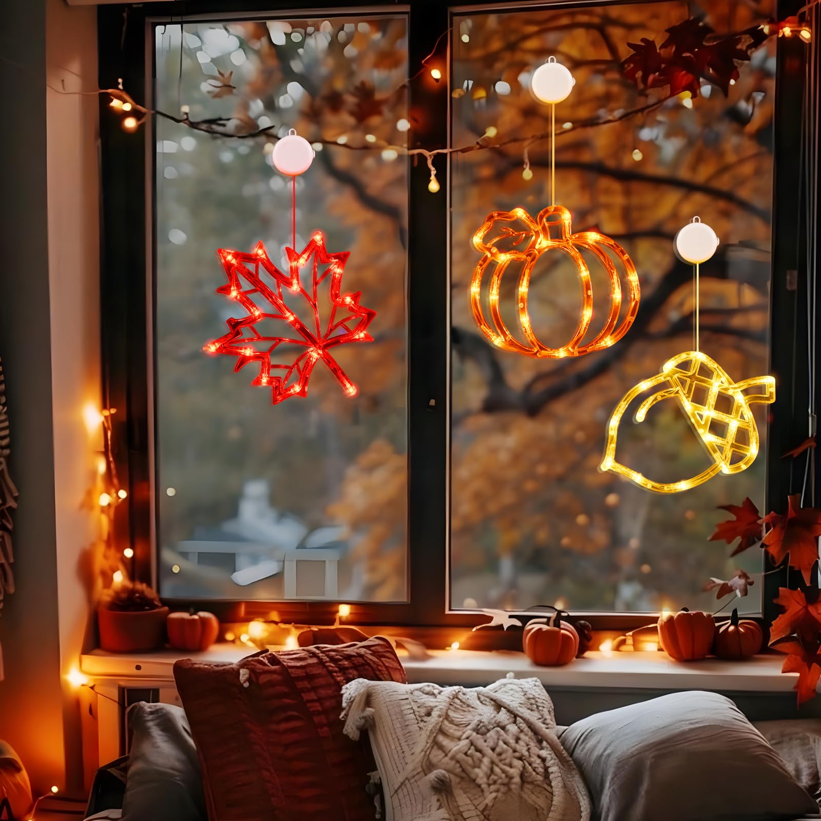 - š FALL DECOR LIGHTS: You will get three Red Orange and Yellow fall LED maple leaves, pumpkin, and acorn lights with suction cups. Dyeing molds can also be decorating your windows during the day.