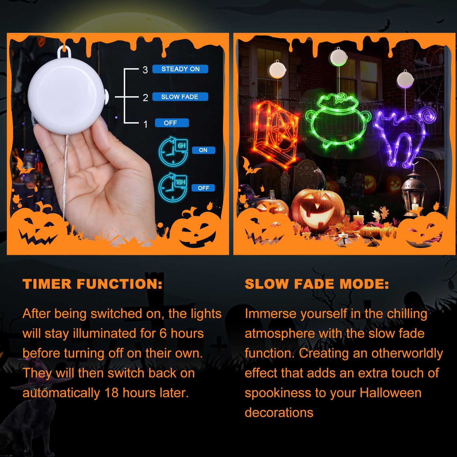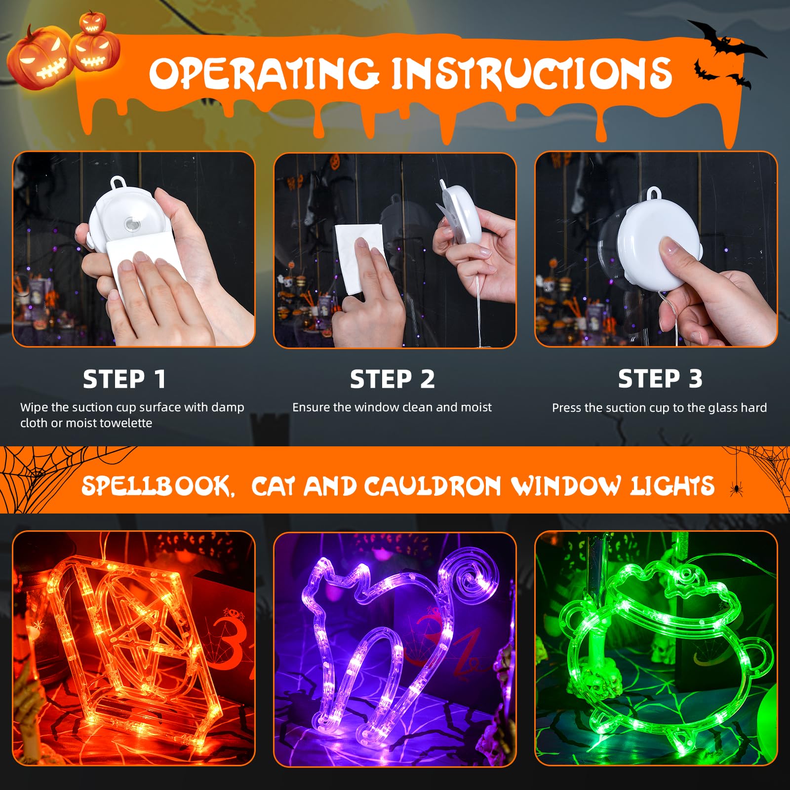 LOLStar Halloween Lights, 3 Packs Spellbook, Cat and Cauldron Halloween Lights with Suction Cup, Upgrade Timer and Slowly Fade Mode Battery Operated Indoor Lights for Halloween Window Decoration