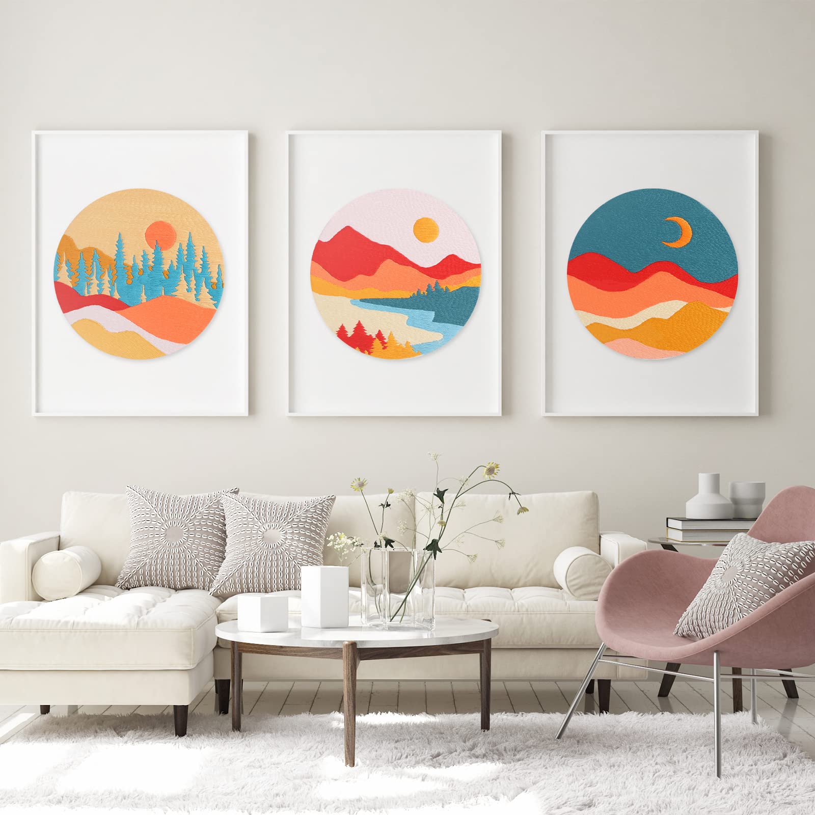 Louise Maelys 3 Set Landscape Embroidery Kits for Beginners with Mountain Sun Moon Pattern,Adults Starter Cross Stitch Kit DIY Needlepoint