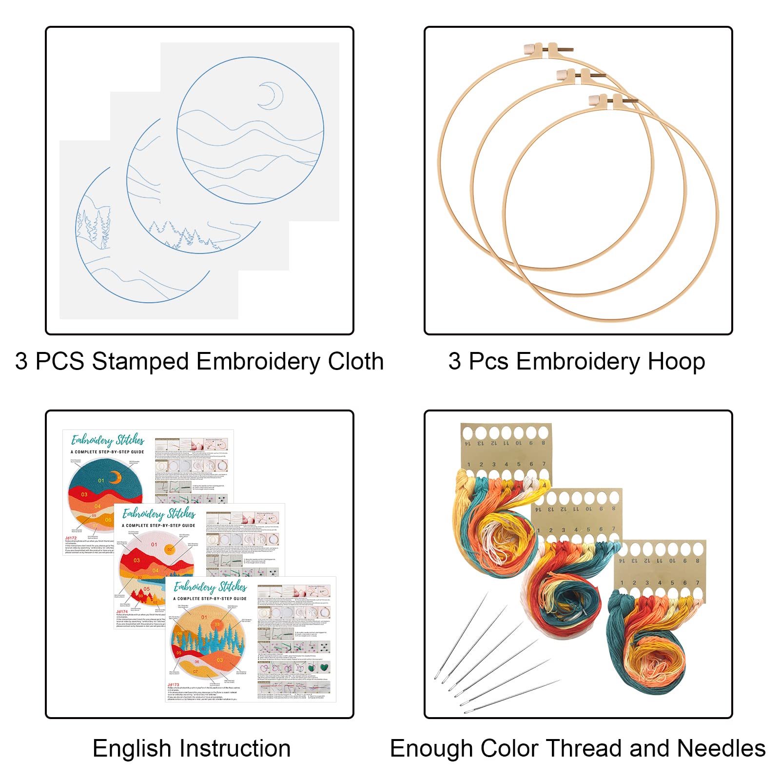 - Embroidery Kits Package: This cross stitch kit for Adults including 3 x embroidery fabric with pattern,3 x plastic embroidery hoop(hoop size:7.8 inch),3x English instruction,6 x embroidery needles and colored flosses