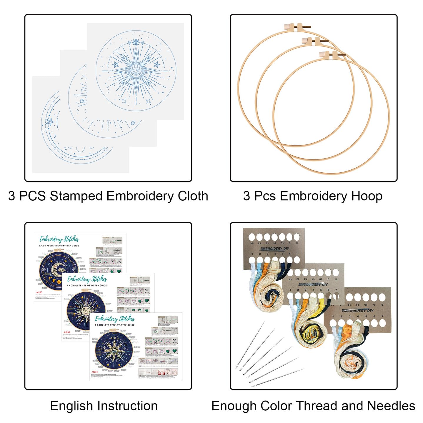 Louise Maelys 3 Set Tarot Embroidery Kits for Beginners,Cross Stitch Kit for Adults,Starters DIY Needlepoint Including Embroidery Cloth with Sun Moon Star Evil Eye Pattern and Instructions
