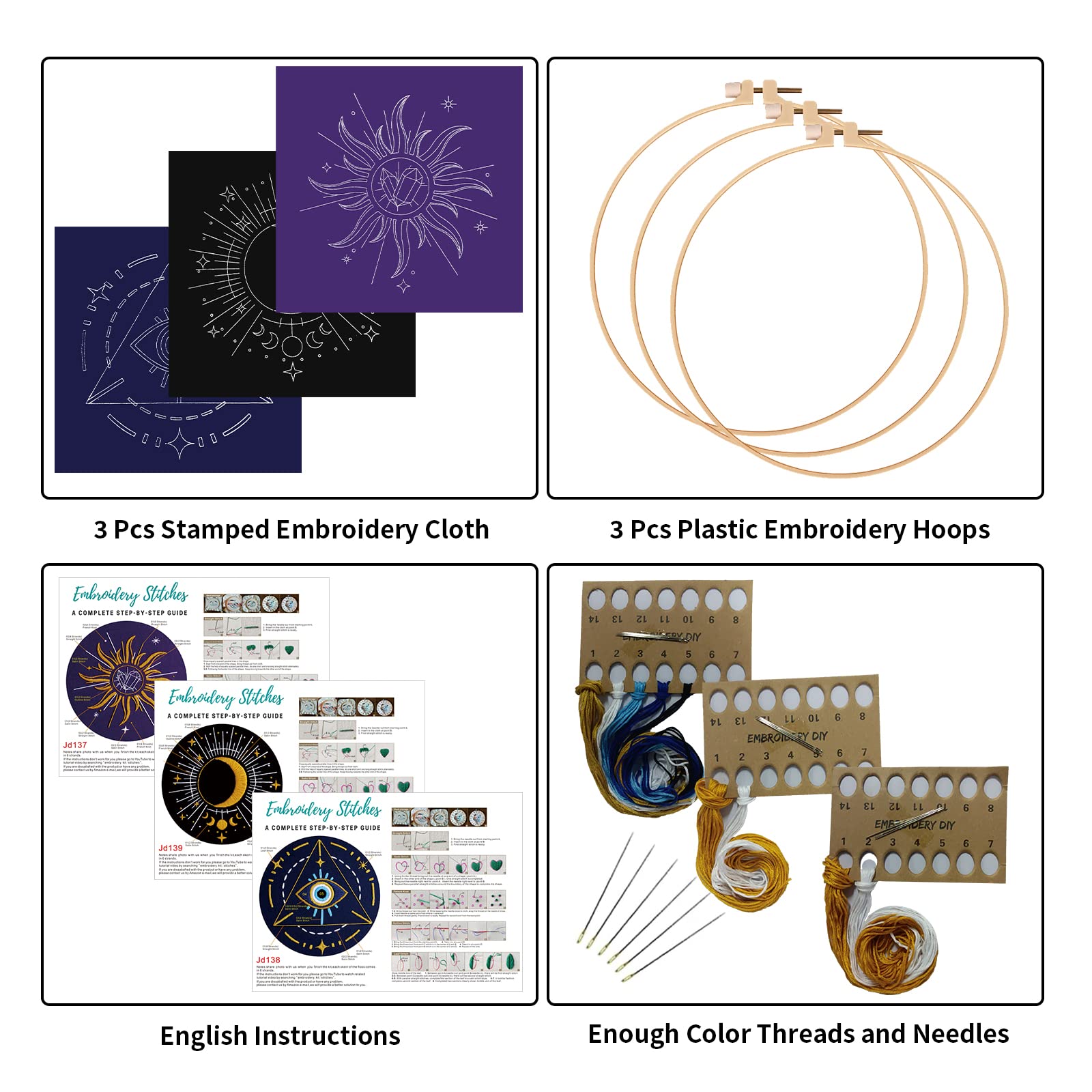 - Tarot Element Pattern: There are Sun Moon Star Evil Eye pattern on the embroidery cloth,which will provide great help for Embroidery beginners.Three different tarot styles of embroidery will let you to experience more technique of embroidery
