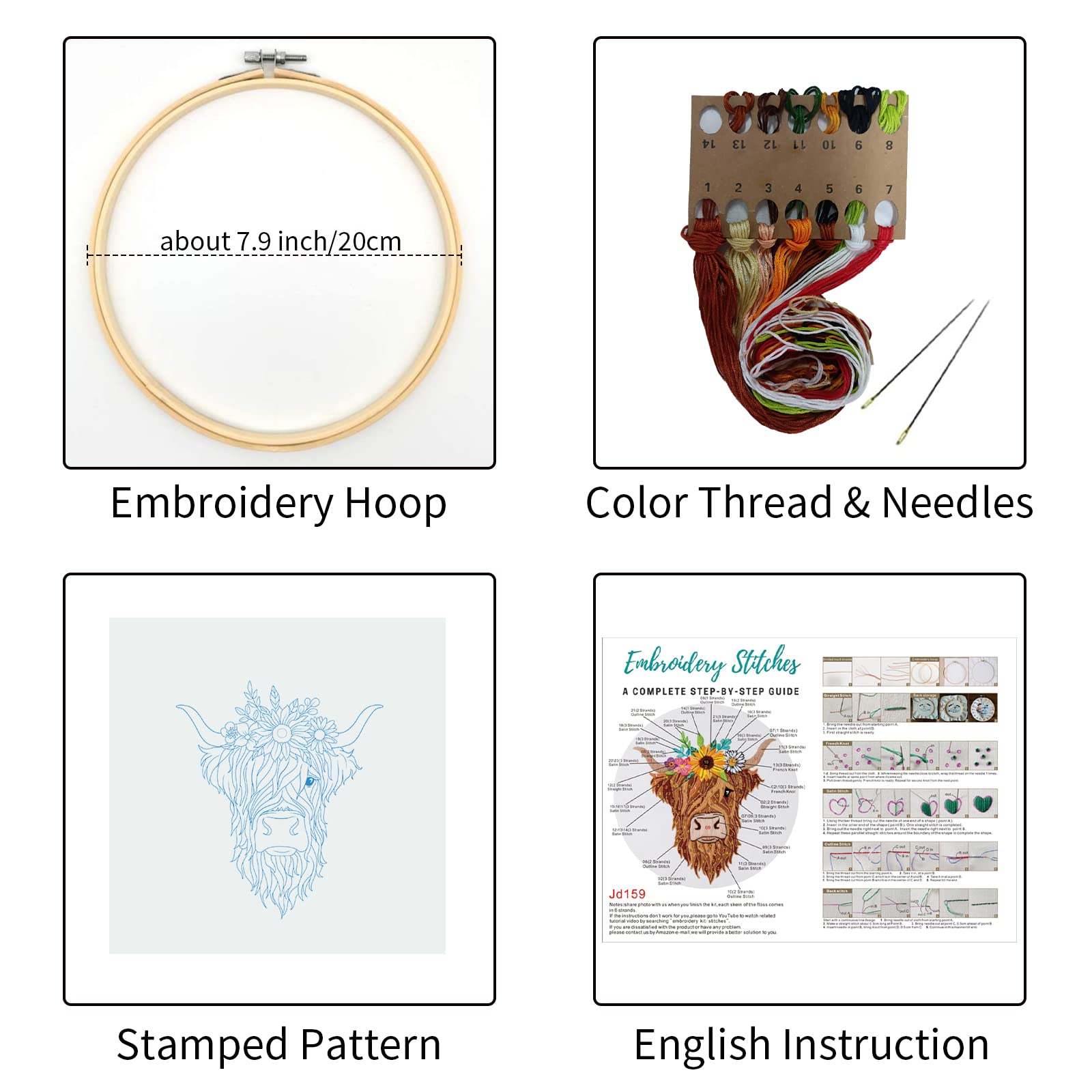 - Valuable Hand Embroidery kit:This cross stitch kit for Adults including embroidery fabric with pattern, plastic embroidery hoop(hoop size:7.8 inch),English instruction,embroidery needles and colored flosses
