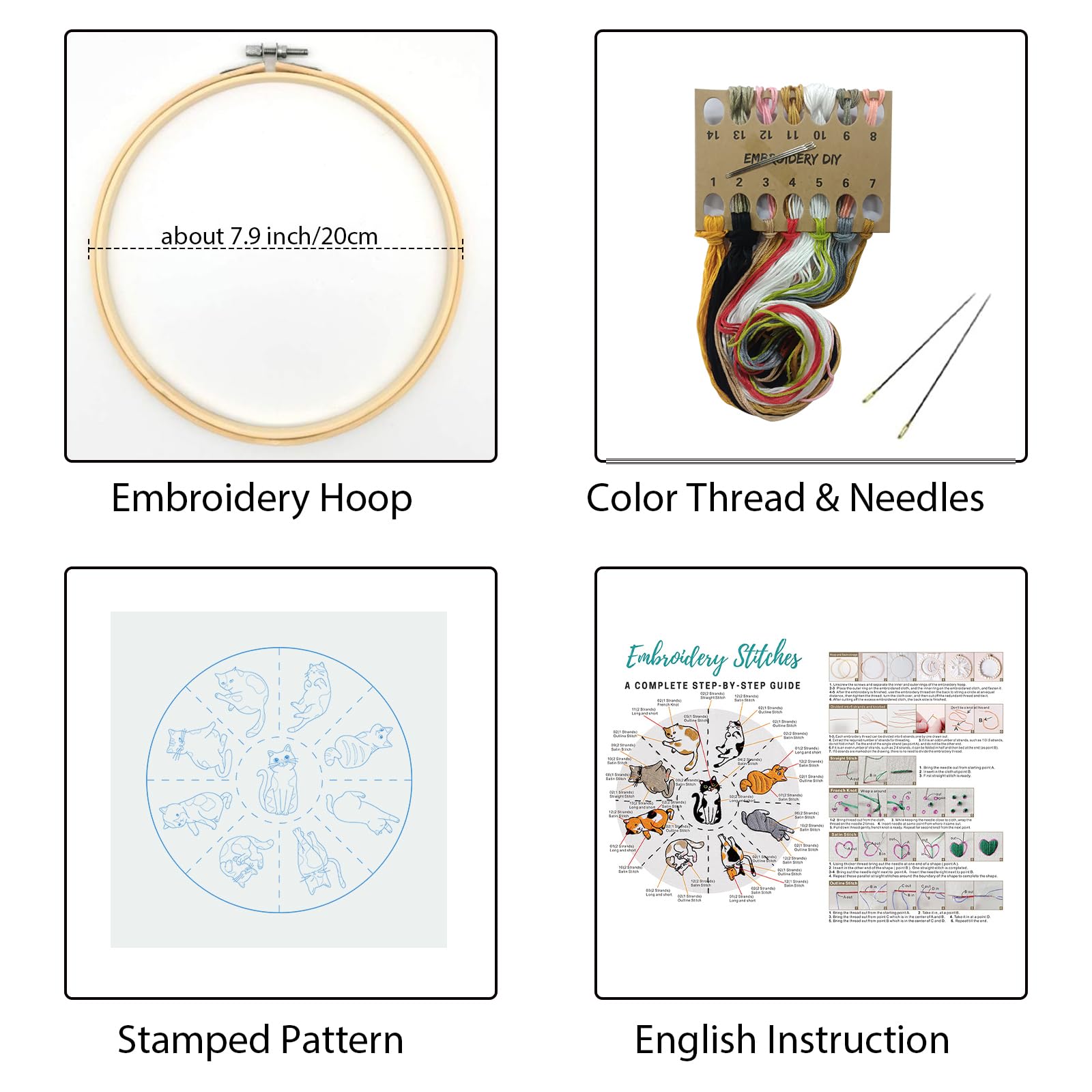 - Hand Embroidery Kit: This basic embroidery Cross stitch kit include 1 pcs embroidery cloth , 1 pcs plastic hoop(hoop size: 7.9 inch), 1 pcs English instruction, 2pcs needles, and enough color threads