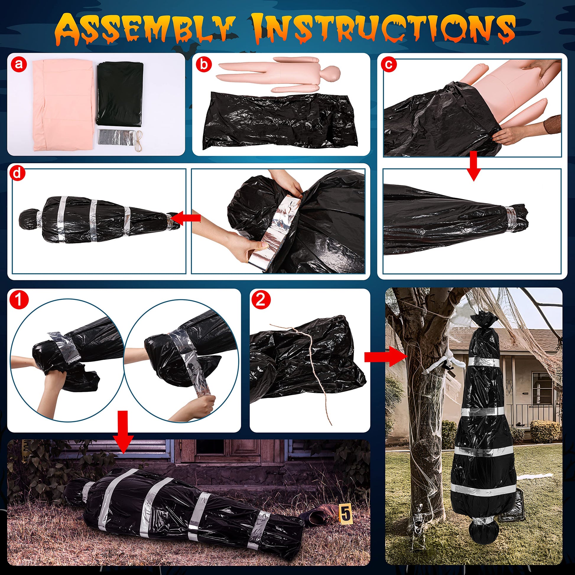 - How to assemble - Simply blow up the victim prop with the pump (not included), put it in the black bag, and wrap the victim prop with silver tape. Awesome creepy prop for halloween crime scene to scare the trick or treaters.
