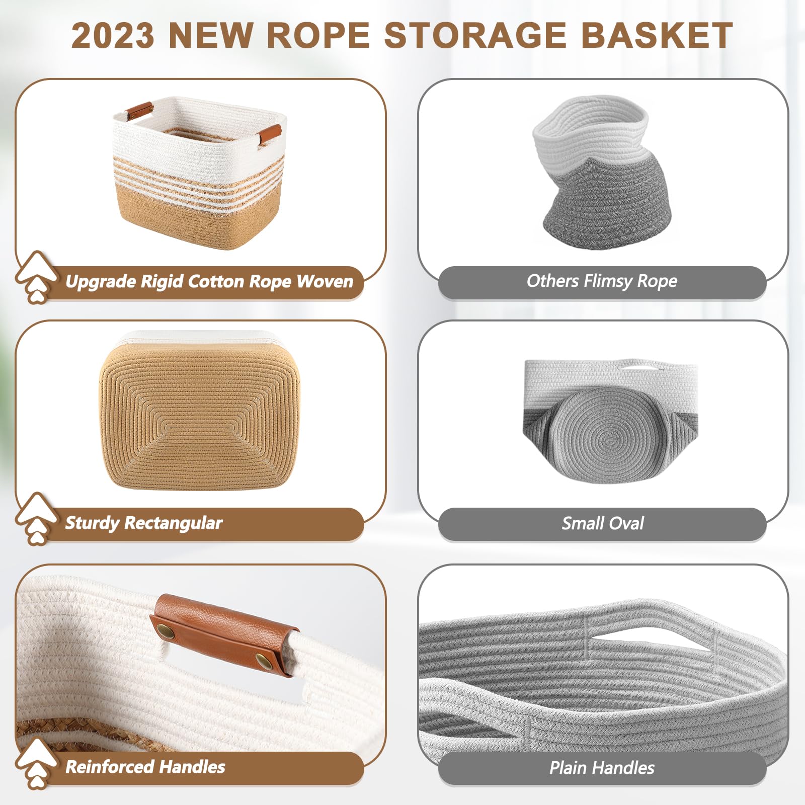 - [ Cotton Rope Baskets for Storage ] The woven rope baskets for storage are the newest upgraded edition in Rectangular Base shape instead of the oval bottom that makes it more rigid, tight, and hold its structure. The handles of the gift baskets empty on both sides are wrapped in brown natural leather, which is easy to carry and not harmful to your hand. For the reason of twice more capacity than small baskets, no matter used for gift baskets, laundry basket, book basket, baby toy basket, dog toy basket, magazine basket, pantry baskets, easter baskets or decorative baskets, Our natural rope organizer bin is your perfect choice.