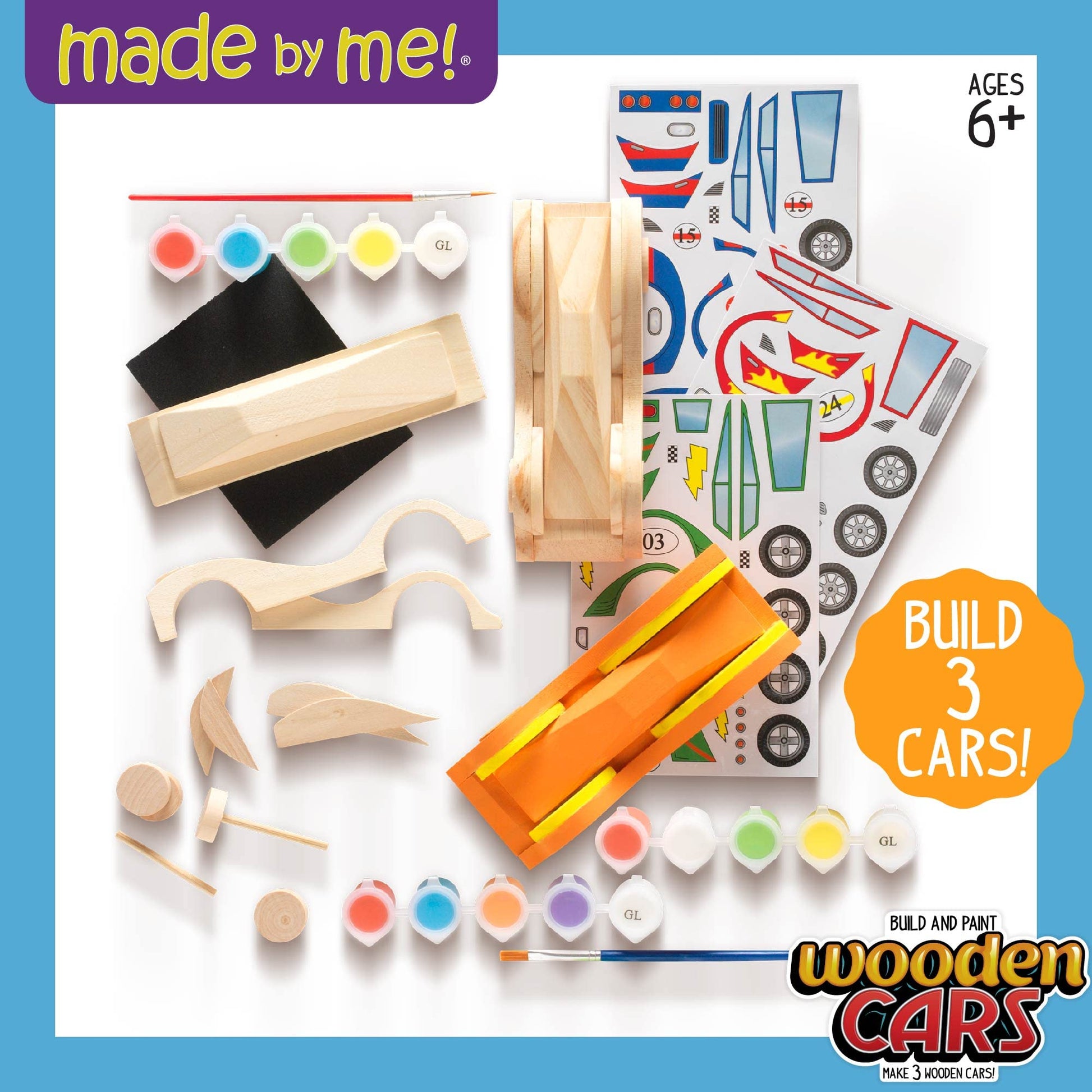 Details: Product Description Build and paint 3 wooden cars with Made By Me! On your marks, get set, go! Get started by following the fully illustrated instructions, they’ll show you exactly where to glue 42 pre-cut and sanded wooden pieces to bring your racecars to life. 42 Pre-Cut and Pre-Sanded Wooden Pieces, Sand Paper, 3 Sticker Sheets, 12 Pots of Acrylic Paint (0.101 fl oz each), 3 Pots of Glue (.101 f oz each), 2 Paintbrushes,