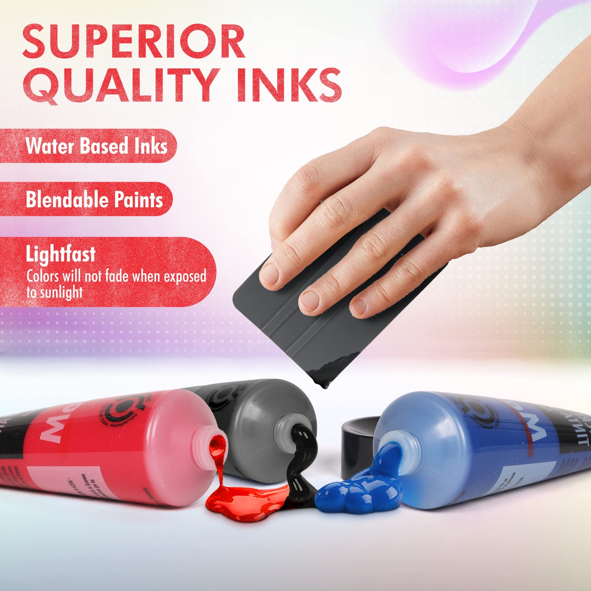 - WATER-BASED INKS – Our screen printing beginners kit includes a set of 3 x 3.38 fl. oz screen printing inks (Primary Magenta, Primary Cyan, Carbon Black). Each ink is water-soluble, making it gentle and soft to the touch, giving an incredible feel.