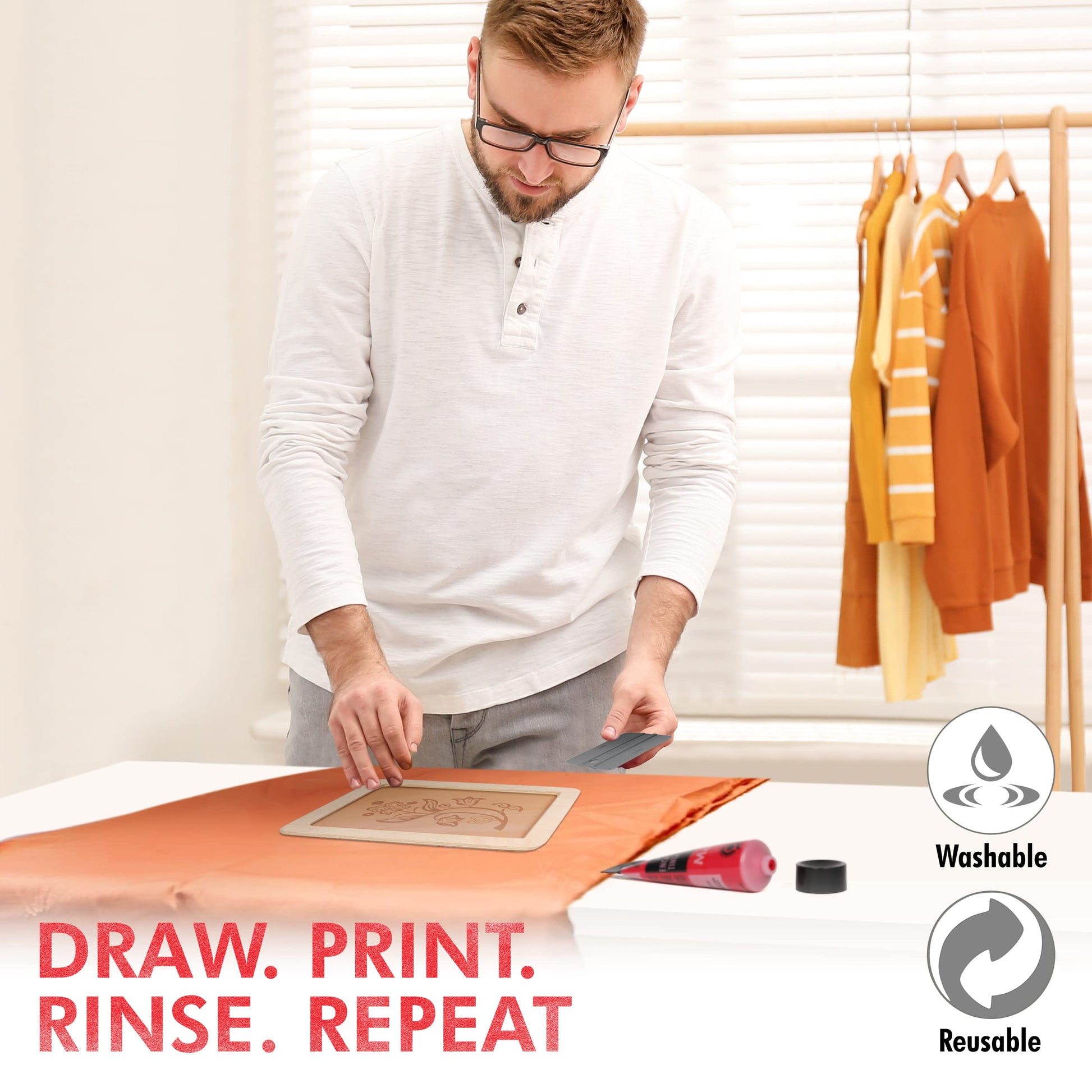 - Apply a line of ink approximately 0.5"" wide to the top edge of the screen. 4 - Use the squeegee to spread the ink over the motif from top to bottom without pressure. Make sure all areas to be printed are covered in ink. The screen is flooded. Next, drag the squeegee over the motif from top to bottom applying even pressure. This transfers the ink to the fabric. Carefully lift the screen off the fabric. When the printing process is complete, clean the screen and stencil immediately and leave to dry. 5 - After drying, heat set in the oven (8 minutes / 150 °C - 302 °F) or iron without steam for 3 minutes. 6 - The inks are water-based, saliva-resistant, washable to 40°C/104°F, and soft to the touch. TIPS: Place paper or film between the layers of fabric - Shake paints before use - The best results are achieved on 100% cotton - The fabric needs to be free of any finishes and conditioners - Wash the fabric before use. Note: This screen printing supplies set includes 1 screen, a squeegee, and 3 colors of screen printing ink.
