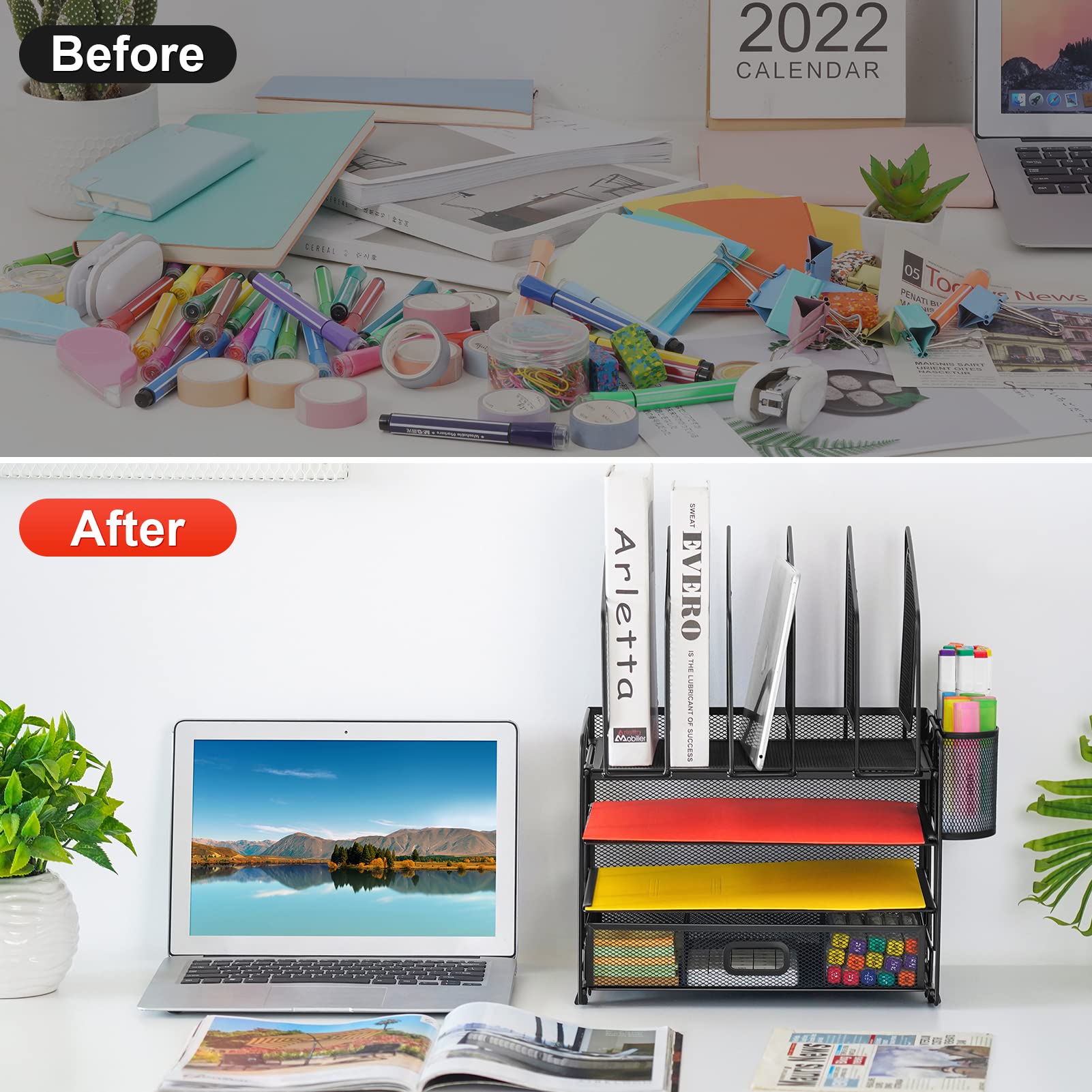 - 【Multifunctional Desk organizer】Marbrasse upgrade desktop file organizer has vertical and horizontal storage space – 4 sliding trays +5 vertical sorters +3 compartments drawer+ additional 2 pen holders . Upright section has five 2" Compartments for magazines, bill, file, book. Three types of use to meet your various office needs!!