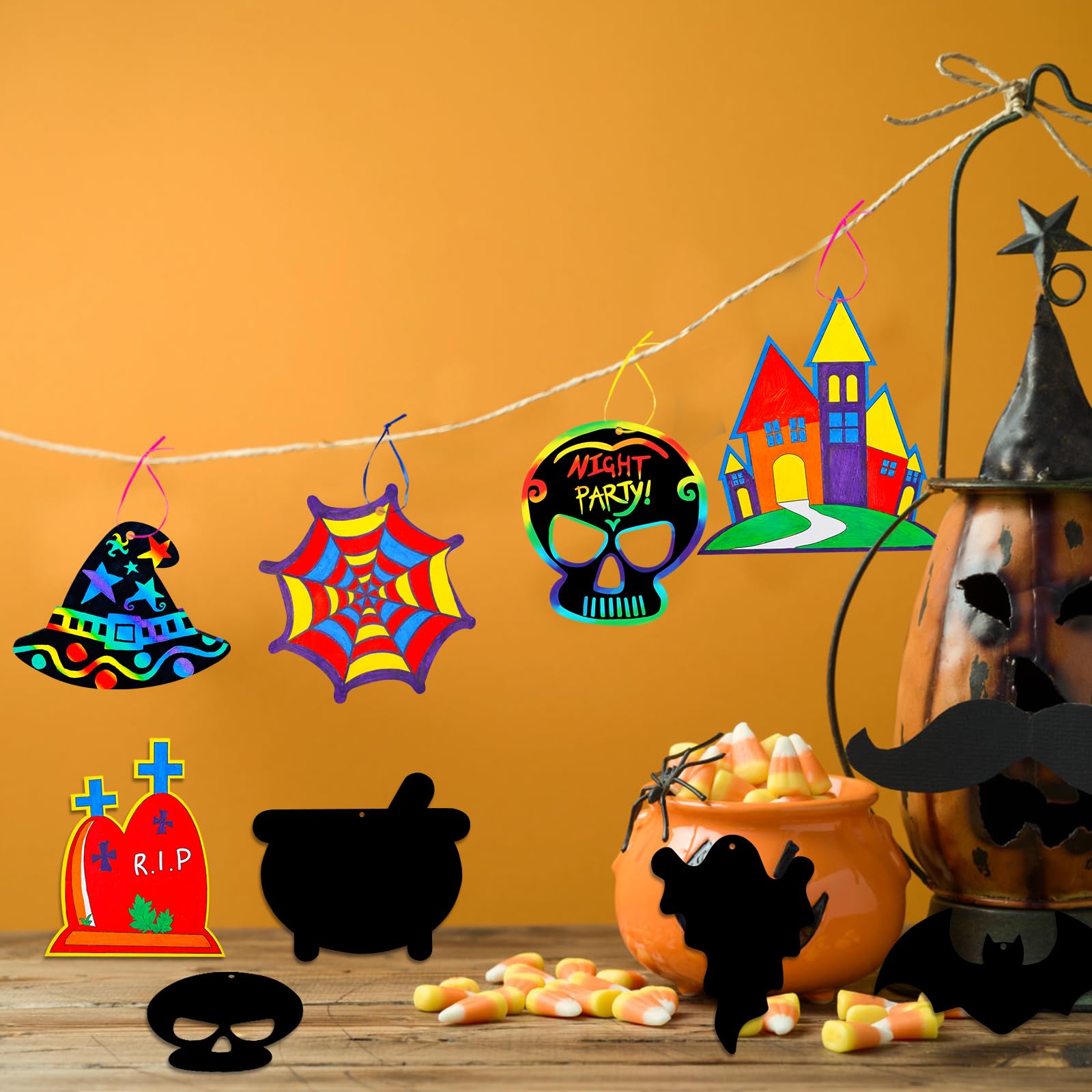 Max Fun Halloween Crafts for Kids Scratch Off Art Paper Cards 48Pack, Magic Rainbow Ornaments Hanging Supplies Educational Toys Kit Halloween Party Games Favor