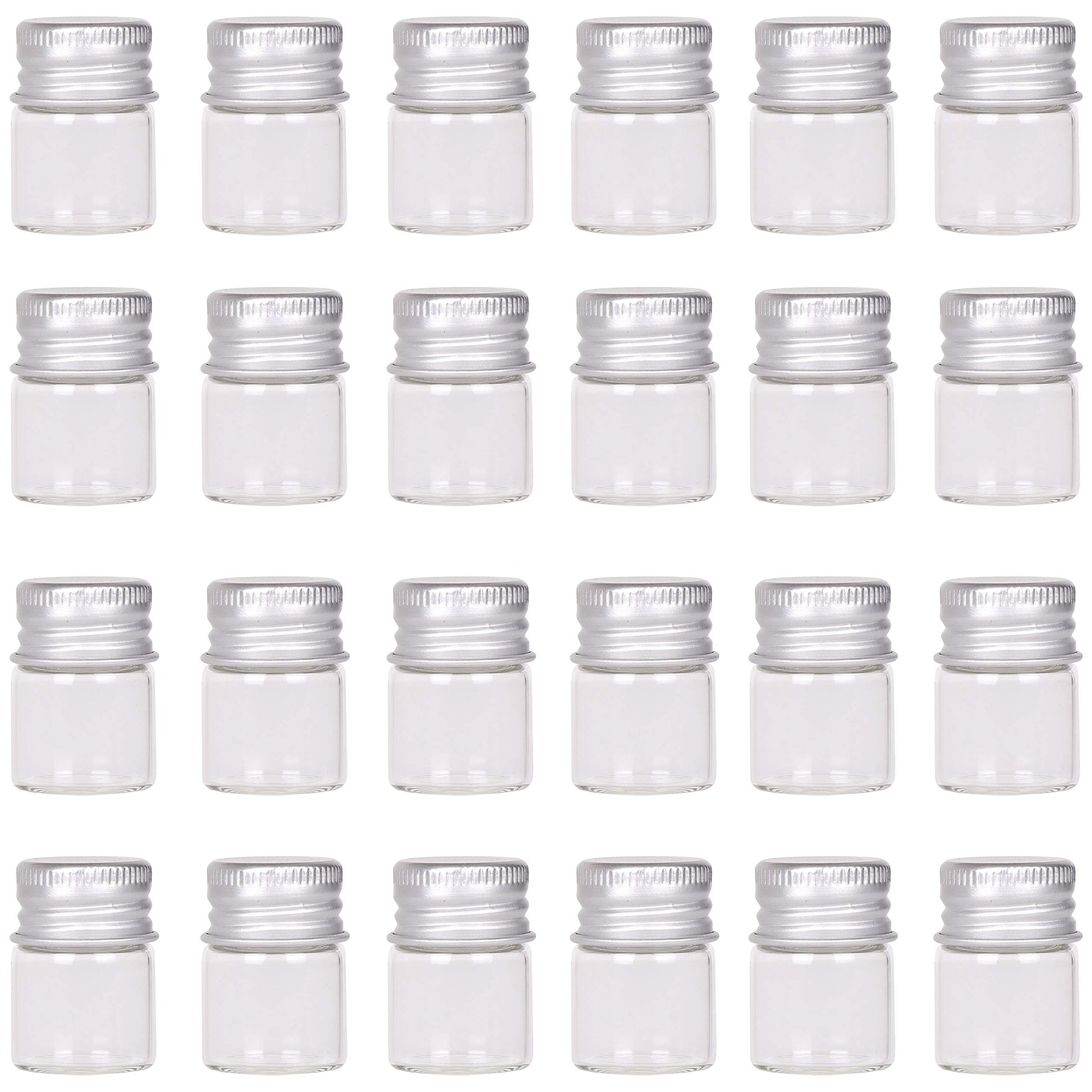 MaxMau Mini Glass Bottles with Screw Caps 5ml 24 Sets Aluminum Top Metal Lids 5 Milliliter Tiny Vials Small Jars DIY Storage Art Craft Decor