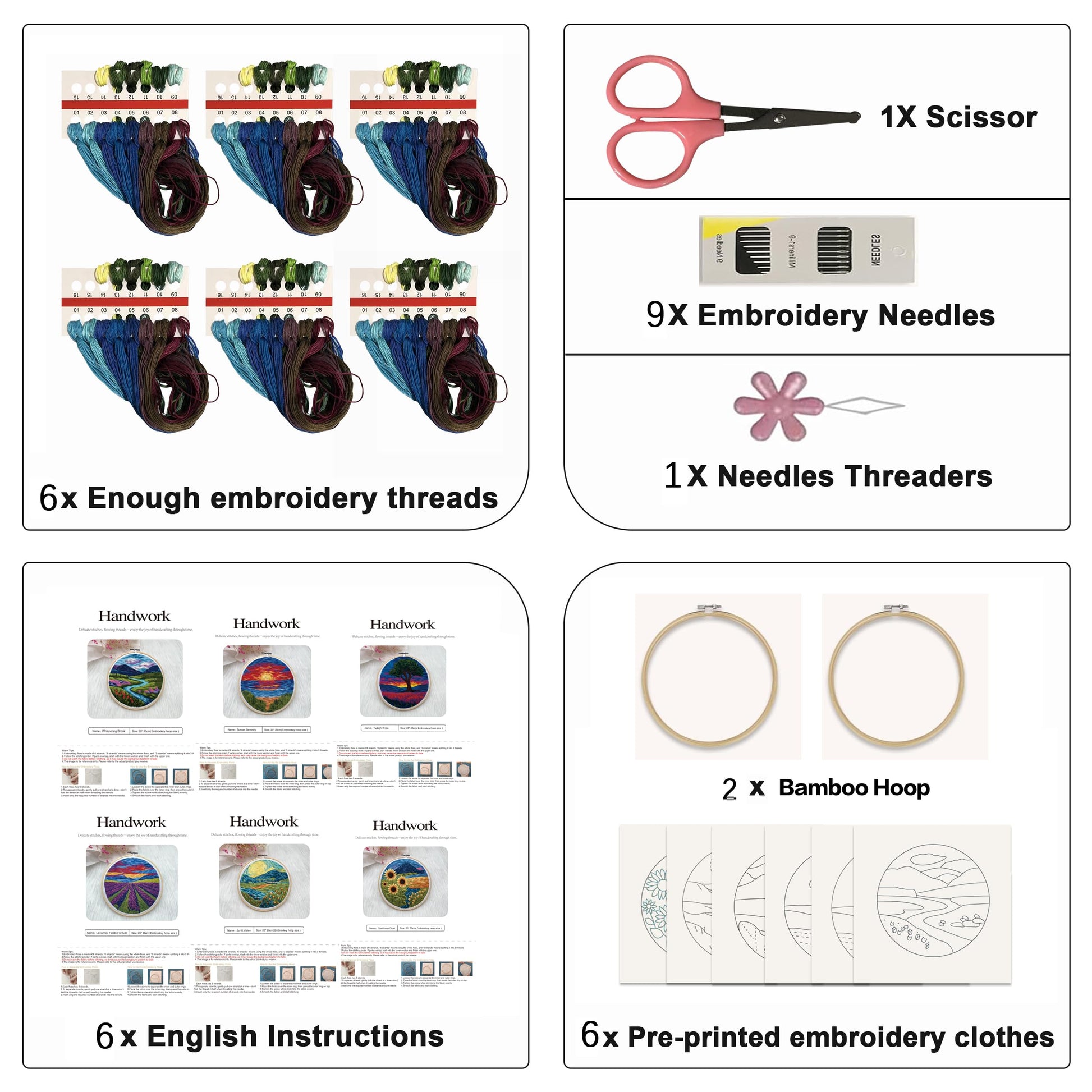 - 【Embroidery kit for beginners adults of package】 The package includes everything for starter, including 6x embroidery cloth with pattern, 2 x embroidery stretcher, 1 x water drop threaders, 1 × embroidery scissors, embroidery needles and colored floss.
