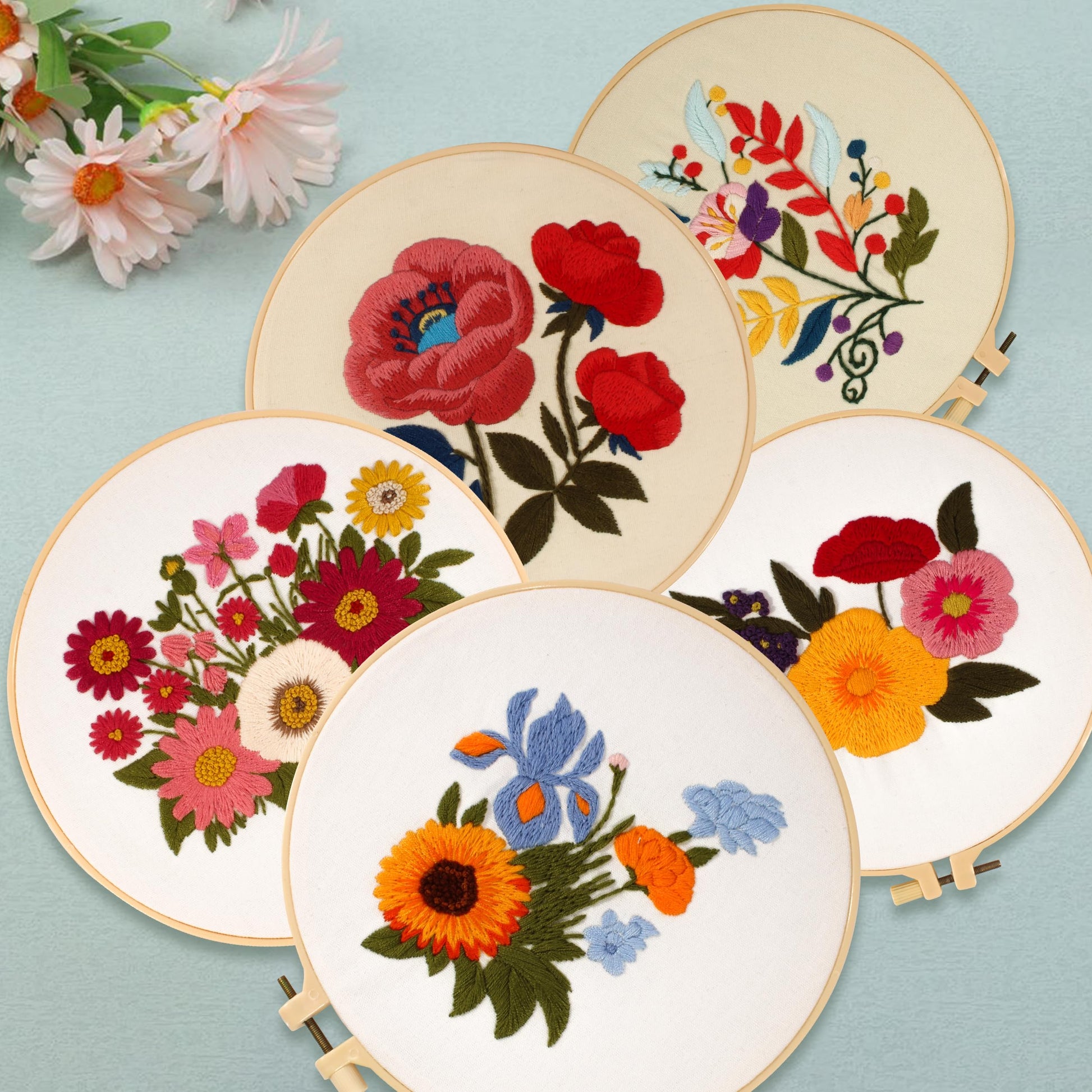 Maydear Complete Embroidery Starter Kit for Beginners - 5 Sets Punch Needle Set with Patterns, Hoops, Threads & Stitch Practice Guide for Adults, DIY Hand Embroidery Craft Kit