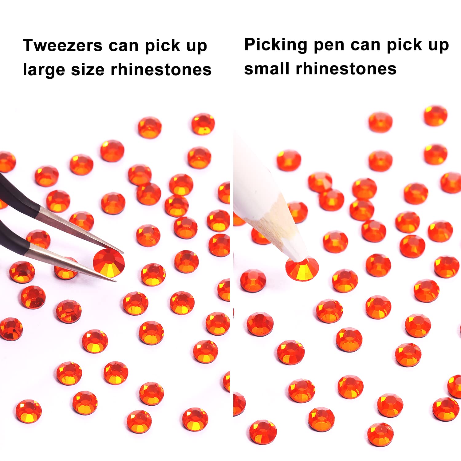 - Use tweezers and Picking Pen gem picker to pick rhinestones, Hotfix Applicator or household ironer, heat press machine for heat repair and fixation, after the heat activated glue melts, stick on the object and lightly press the rhinestones for about 5 seconds. Can also be glued with E6000 glue