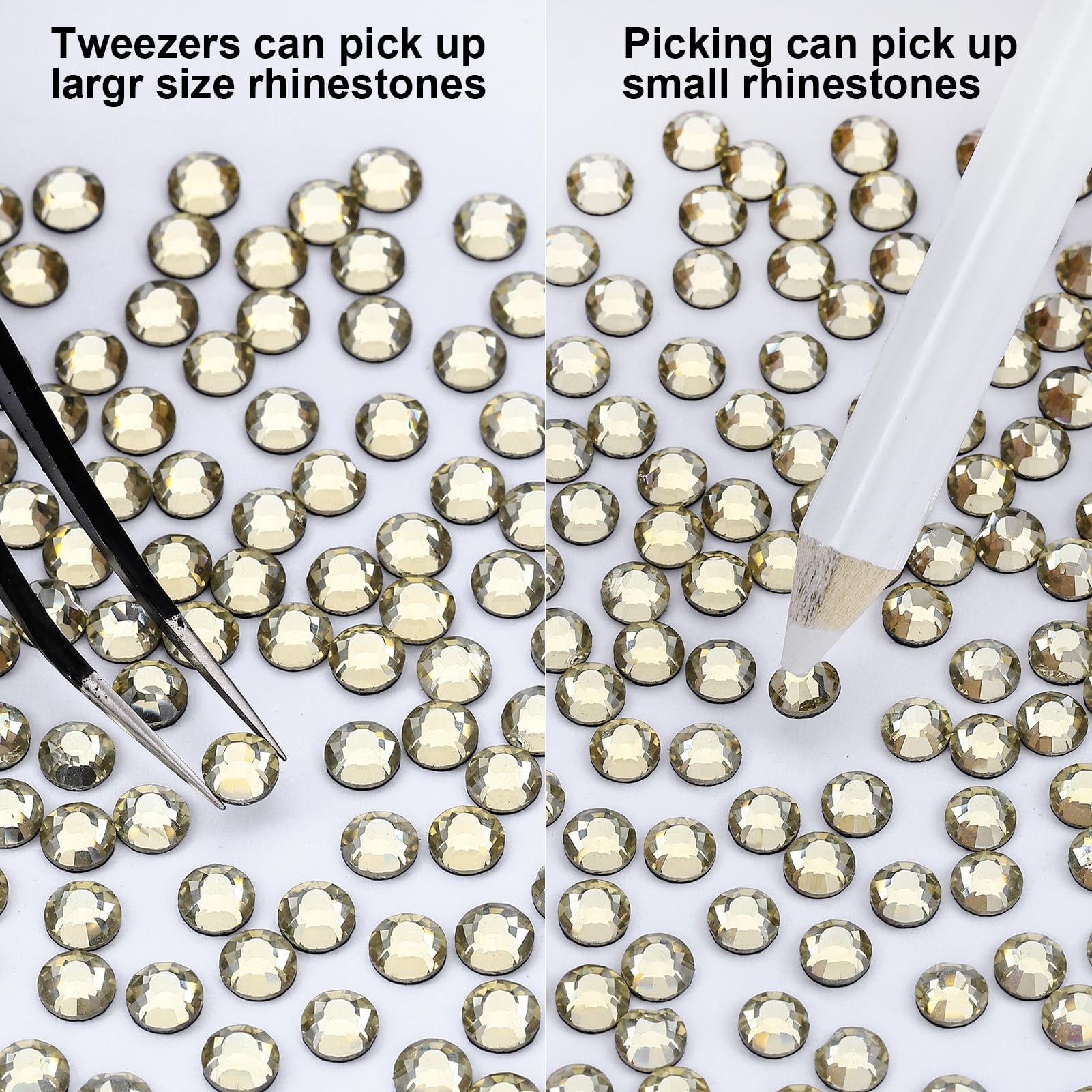 - Use tweezers and Picking Pen gem picker to pick rhinestones, Hotfix Applicator or household ironer, heat press machine for heat repair and fixation, after the heat activated glue melts, stick on the object and lightly press the rhinestones for about 5 seconds. Can also be glued with E6000 glue