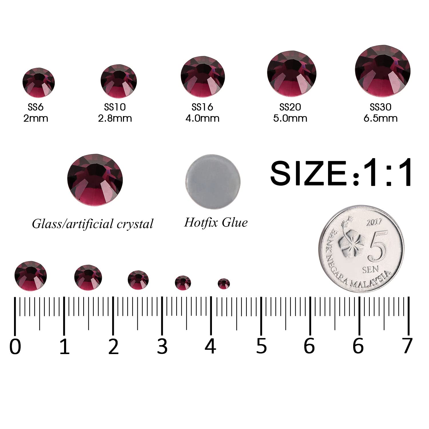 - Material: Glass/Artificial Crystal, Flat Back Round, High-precision cross-section, multi-sided cutting, high brightness, high Sparkly. These thermal repair rhinestone bottoms are heat activated glue that melts and sticks when heated. The Red runs through the entire crystal, and the crystal does not fade