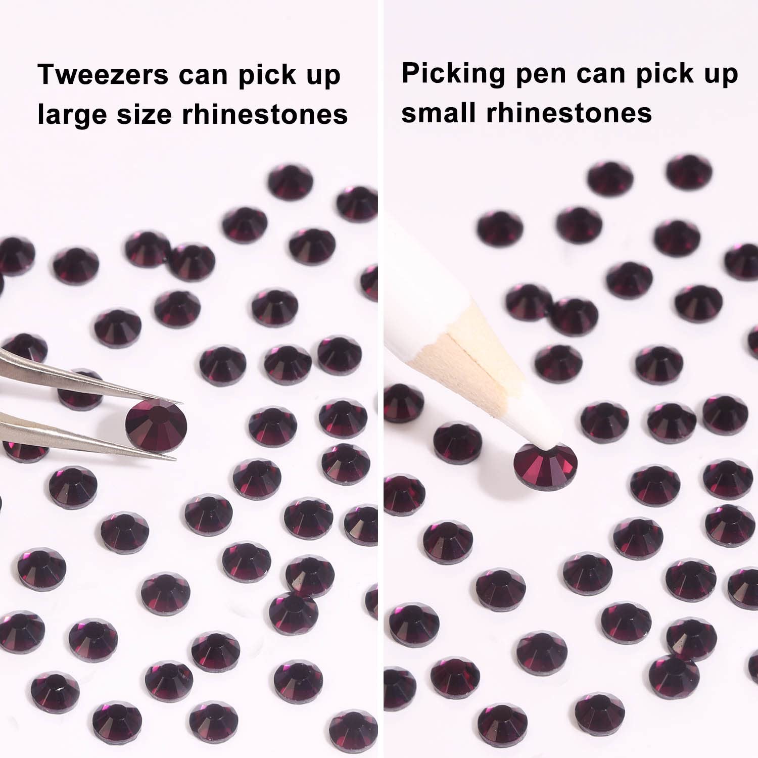 - Use tweezers and Picking Pen gem picker to pick rhinestones, Hotfix Applicator or household ironer, heat press machine for heat repair and fixation, after the heat activated glue melts, stick on the object and lightly press the rhinestones for about 5 seconds. Can also be glued with E6000 glue