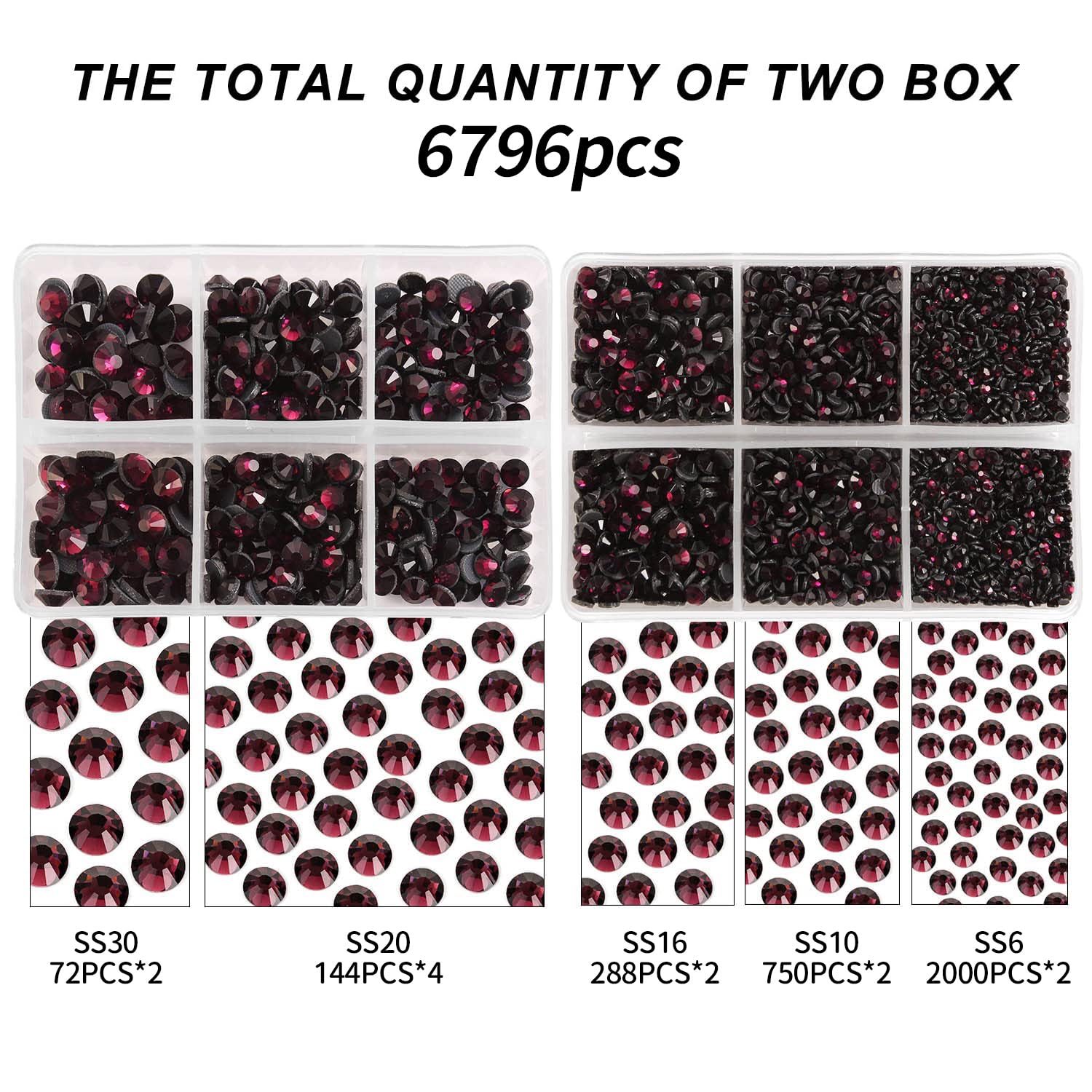 - Product Packaging: Box packaging SS6 2MM - 4000 Pcs, SS10 2.8MM - 1500 Pcs, SS16 4MM - 576 Pcs, SS20 4.8MM - 576 Pcs, SS30 6.5MM - 144 Pcs, 1 pcs tweezers and 1 pcs picking pen