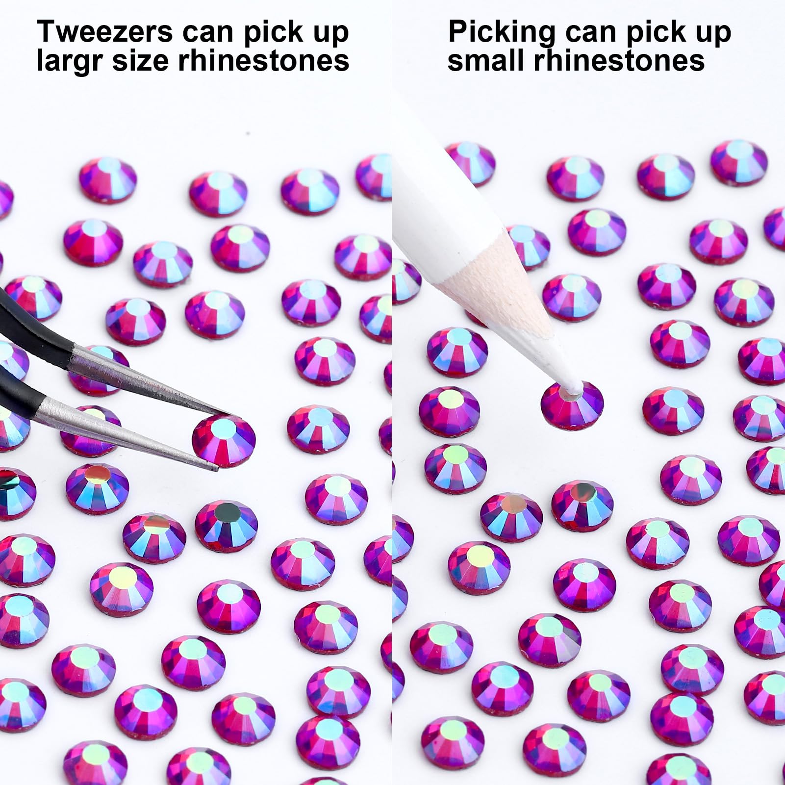 - Use tweezers and Picking Pen gem picker to pick rhinestones, Hotfix Applicator or household ironer, heat press machine for heat repair and fixation, after the heat activated glue melts, stick on the object and lightly press the rhinestones for about 5 seconds. Can also be glued with E6000 glue.