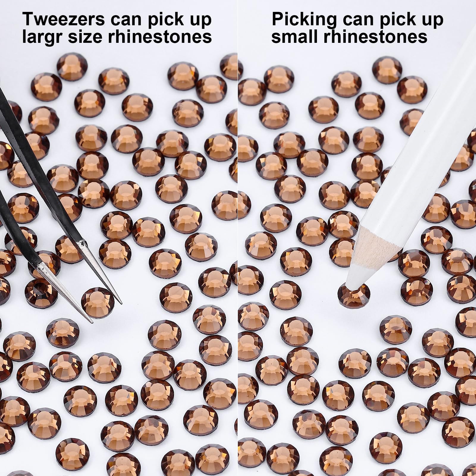 - Use tweezers and Picking Pen gem picker to pick rhinestones, Hotfix Applicator or household ironer, heat press machine for heat repair and fixation, after the heat activated glue melts, stick on the object and lightly press the rhinestones for about 5 seconds. Can also be glued with E6000 glue