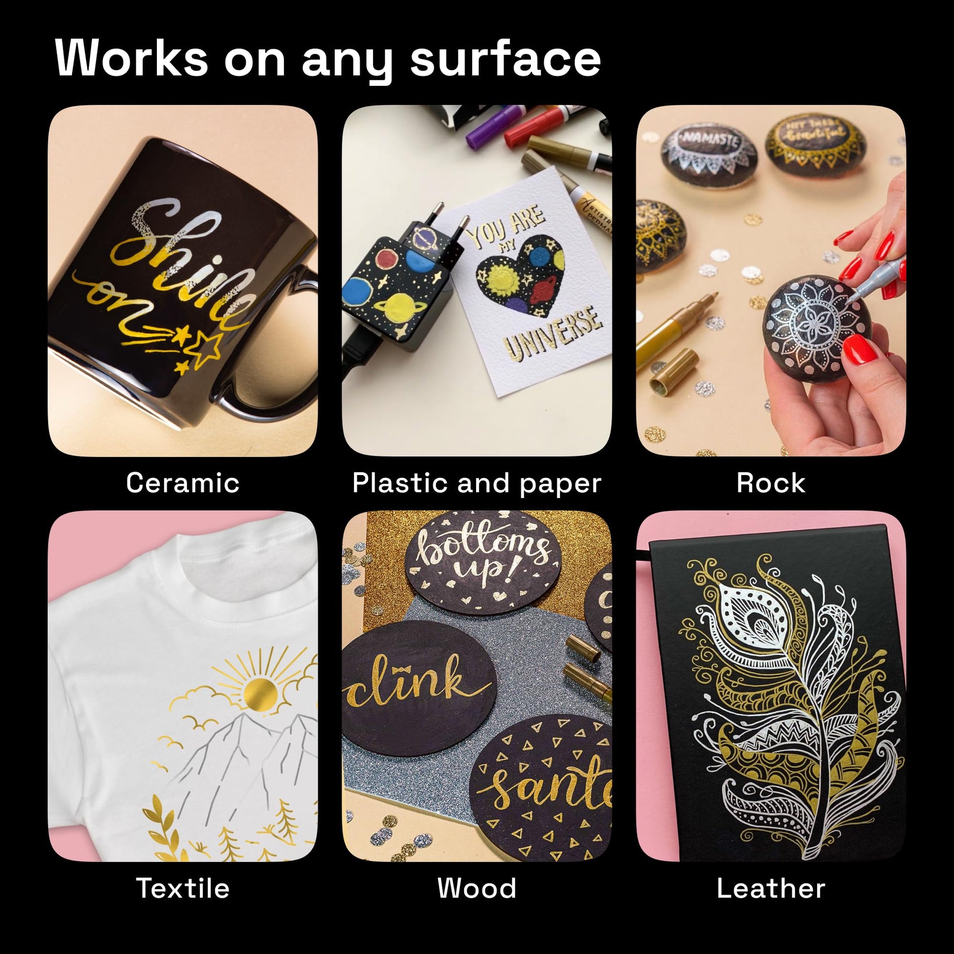 - Any Surface: Use as a tire ink paint pen for car tires, fabric paint pens for clothes permanent, or as permanent paint markers for plastic and glass. Draw with a gold leafing pen on stone, rock, porcelain, wood, ceramics, etc.