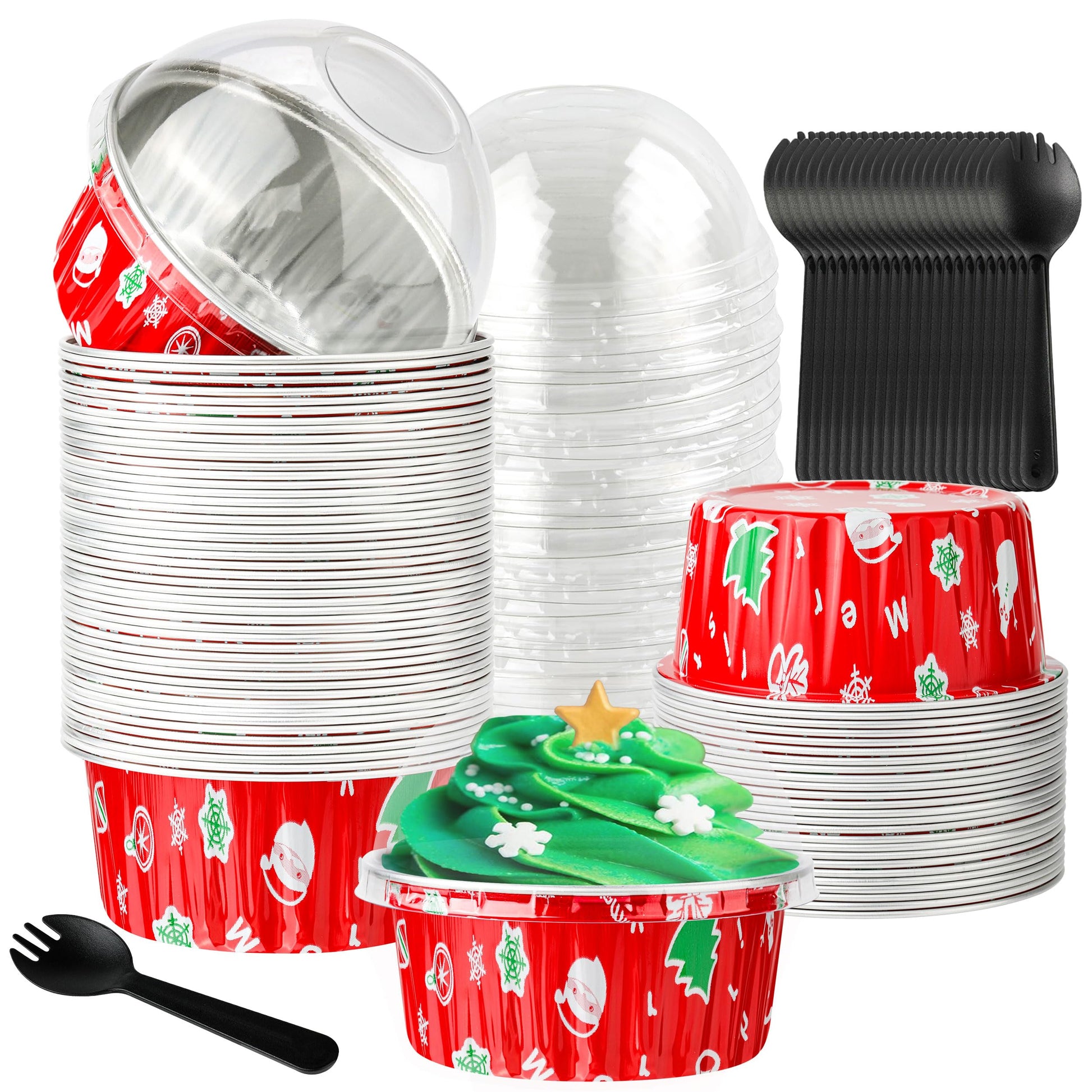 Mini Cake Pans, 50PCS 4OZ Aluminum Foil Baking Cups with Lids Disposable Ramekins Cupcake Containers Wrappers Aluminum Pans With Lids Cake Cups, Red Christmas