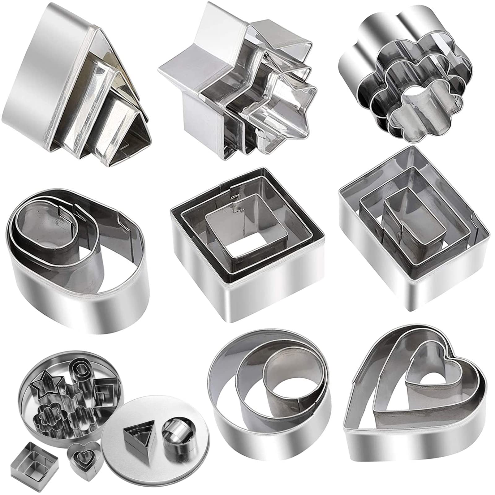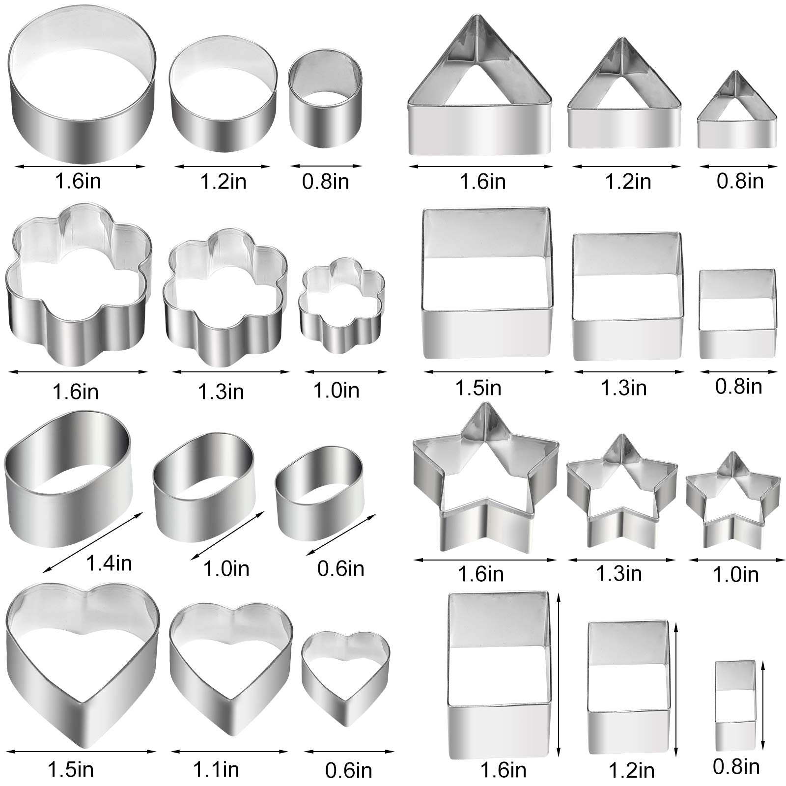 - [24pcs Metal Dough Cutters]Mini Shaped Dough Cutters Set includes 3 sizes of 8 different shapes,3pcs flower shaped cutters,3pcs heart shaped cutters,3pcs circle shaped cutters,3pcs star shaped cutters,3pcs square shaped cutters, 3pcs rectangle shaped cutters, 3pcs triangle shaped cutters, 3pc oval shaped cutters.