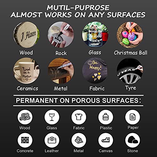 - 【Assorted Colors】3 Basic Colors: Black, White, Red. 2 Metallic Colors: Gold, Silver. These Paint Marker Pens is the best choice to work on rock painting, ceramic, wood, leather, plastic, fabric, canvas, stone, glass, metal and most surfaces.