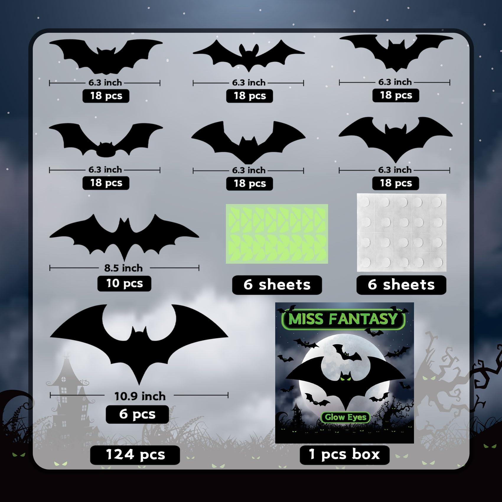 Halloween Decorations - Indoor 3D Bats Wall Decor with Glow Eyes for Home, Room, Bathroom, Outdoor - 124 Pcs