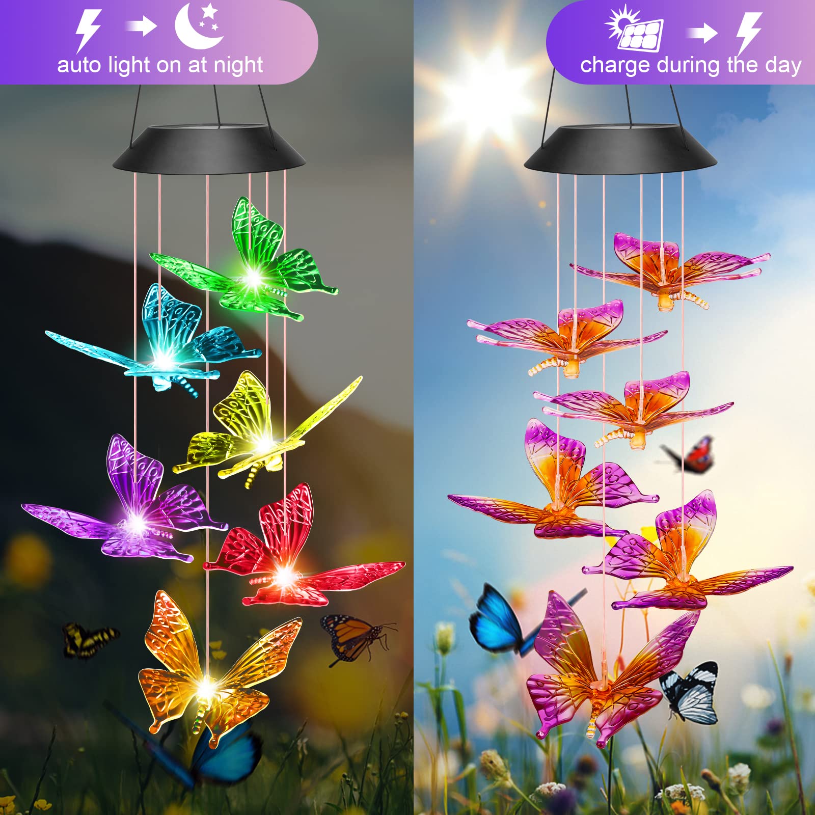 - 【Gardening Decor Lights gifts for mom】: The solar butterfly will changing color 6 - 8 hours (after fully charged) at night automatically.This is unique decoration to hang on the garden trees, fences,lawn,shepherd Hook for garden clearance, the butterfly wind chime flies gently in the breeze.It surprise your mom to get such vivid garden gifts.