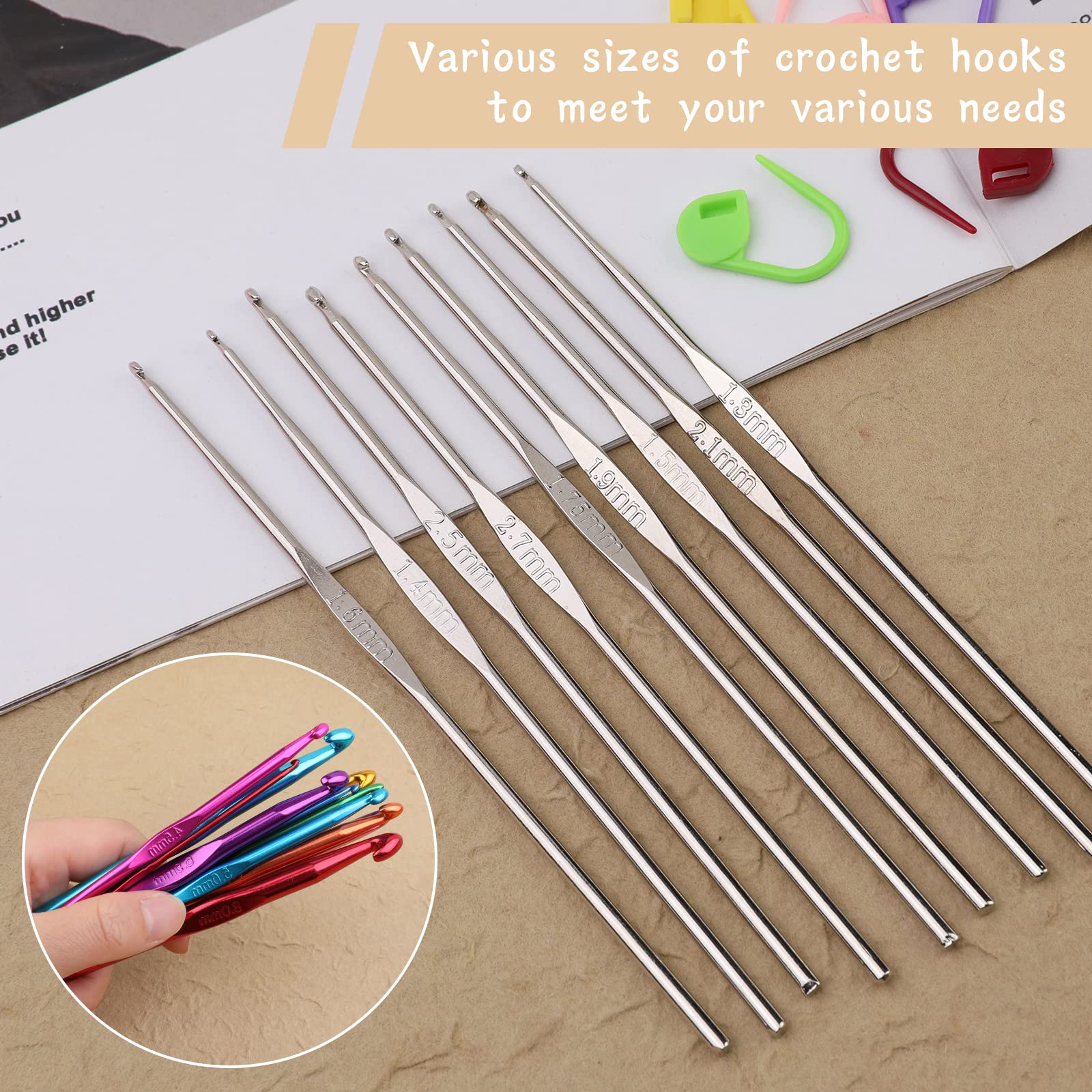 - Crochet Needles Size: The crochet kit for beginners and adults comes with two kinds of crochet hooks, the size of the colorful aluminum crochet hooks is 2.0mm, 2.5mm, 3.0mm, 3.5mm, 4.0mm, 4.5mm, 5.0mm, 5.5mm, 6.0mm, 6.5mm, 7.0mm, 8.0mm. The size of iron crochet hooks is 1.3mm, 1.4mm, 1.5mm, 1.6mm, 1.75mm, 1.9mm, 2.1mm, 2.5mm, and 2.7mm. Two types of crochet hooks can meet your daily crochet needs.