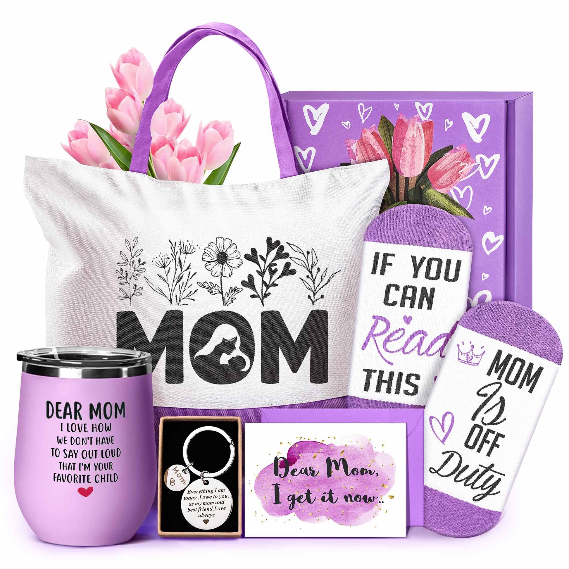 - Thoughtful Gifts for Mom: Inside the beautiful purple mom gift box, you'll find a stylish canvas bag printed with "Mom," a 12oz insulated tumbler featuring "Best Mom Ever," a stainless steel keychain engraved with "Love Mom," and cozy knitted socks that read "If you can read this, Mom is off duty." Each item adds a personal touch, making it perfect for mom gifts from daughters, sons, or wife gifts from husbands to show love and gratitude