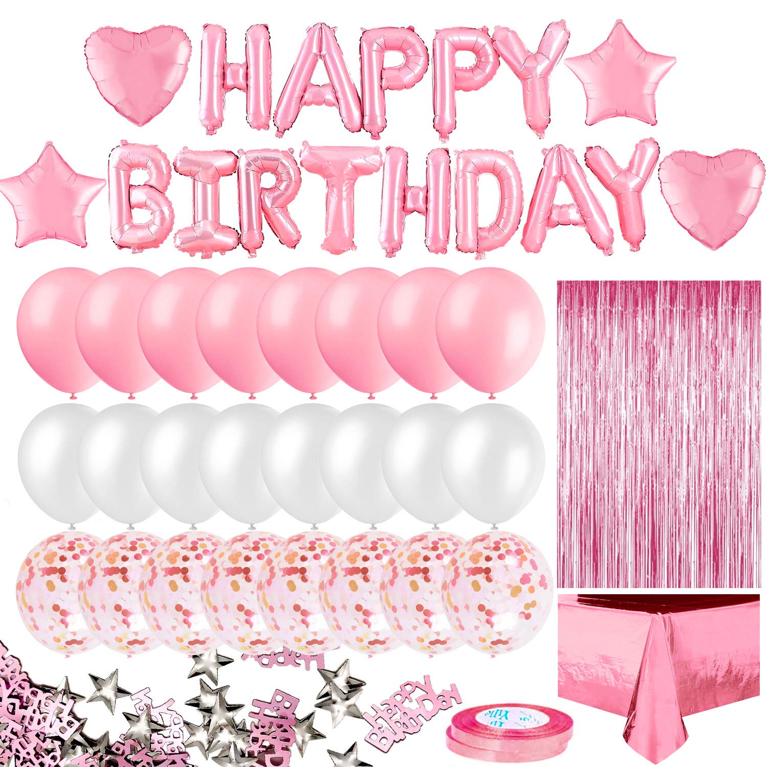 - What you get: Happy Birthday banner, 8pcs confetti balloons, 8pcs pink balloons, 8pcs white balloons, 1pcs pink fringe curtain, 1pcs tablecloth, 4 pcs foil balloons (heart and star), 10g pink birthday confetti, 1 straw, 20m ribbons.