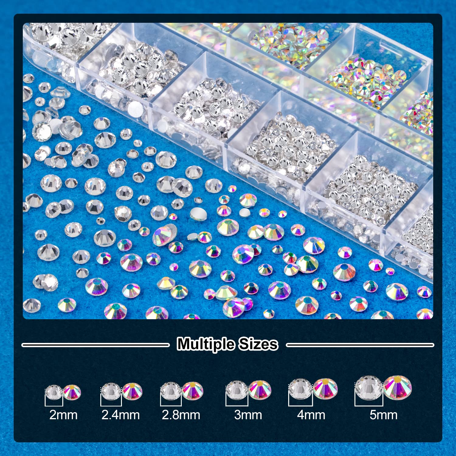 - 💎MULTIPLE SIZES AND COLORS: This set provides 1 box of Flat-back round mixed color rhinestones with 3 sizes: 2mm, 3mm, 4mm; 1 box of Flat-back round glass AB&clear gems with 6 sizes: 2mm、2.4mm、2.8mm、3mm、4mm、5mm. Great size range and various colors for your nail art decoration!